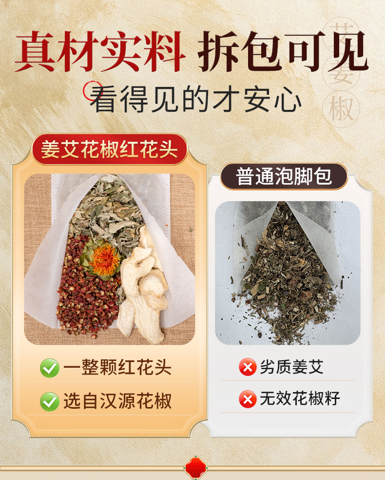 净含量 【每包整颗红花】升级汉源花椒,【4味红花款】姜艾花椒红花,【每包三块姜】姜艾,【排湿·专属】 -30g*30包,【排寒·专属】 -30g*30包,【汉源花椒】经典三味,【老北京配方】30g*30包,【花椒驱han暖身】30g*30包