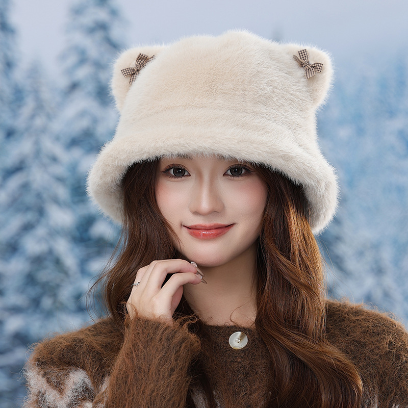 日系可爱小珍珠蝴蝶结耳朵毛绒渔夫帽子女冬季百学生加厚保暖盆帽