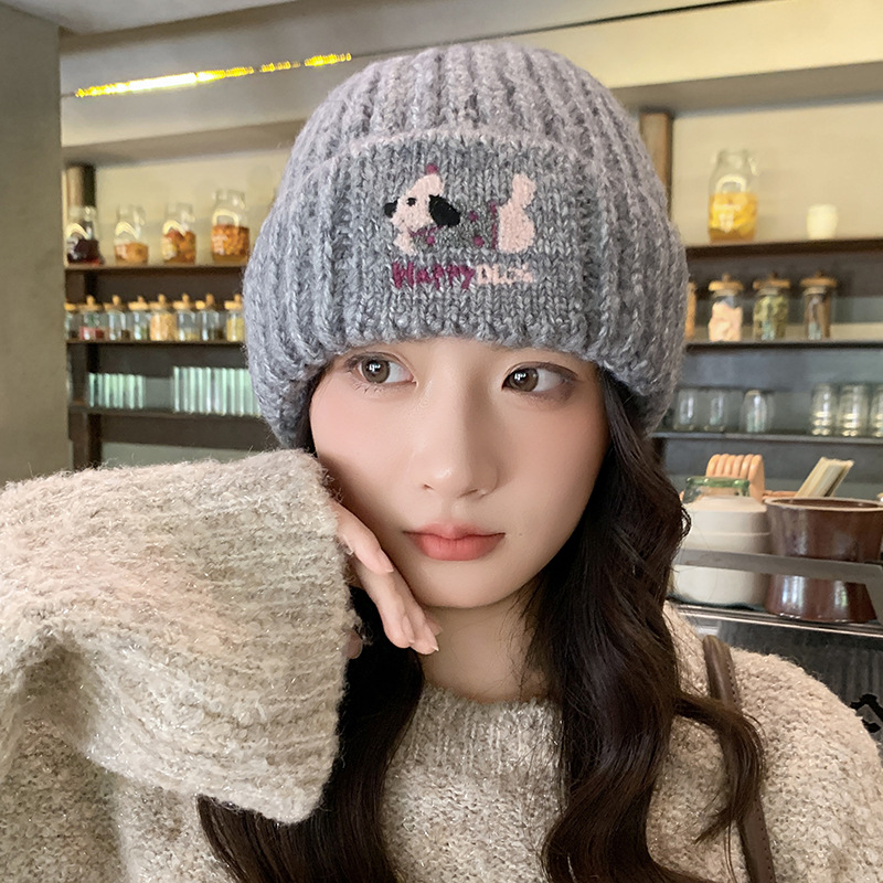 秋冬韩系ins可爱腊肠狗刺绣针织毛线帽大头围显脸小保暖防风百搭