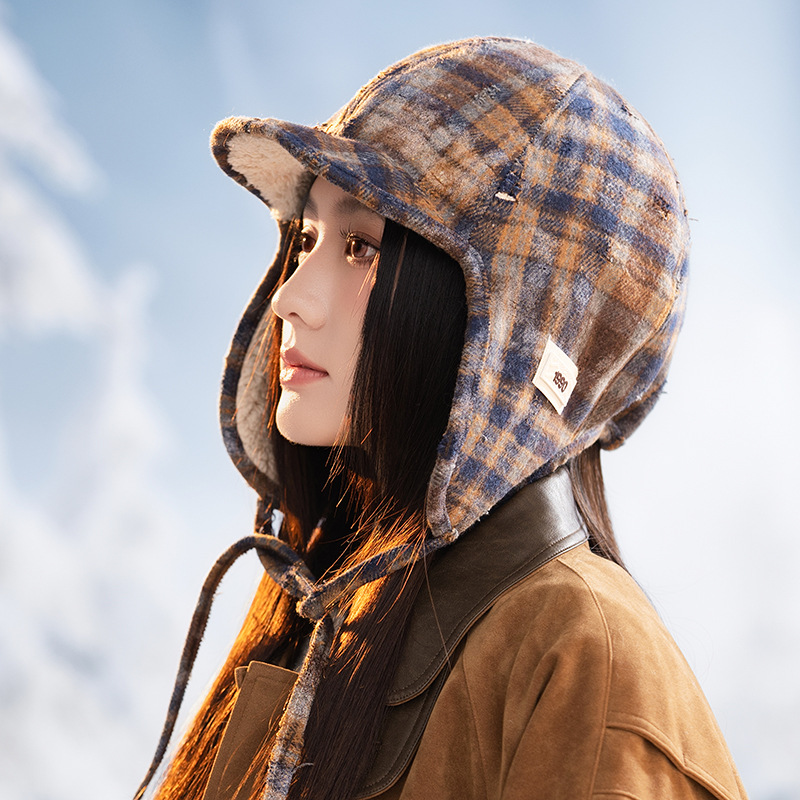 彩色格子飞行帽子女秋冬保暖防风滑雪雷锋帽羊羔毛护耳鸭舌帽潮男
