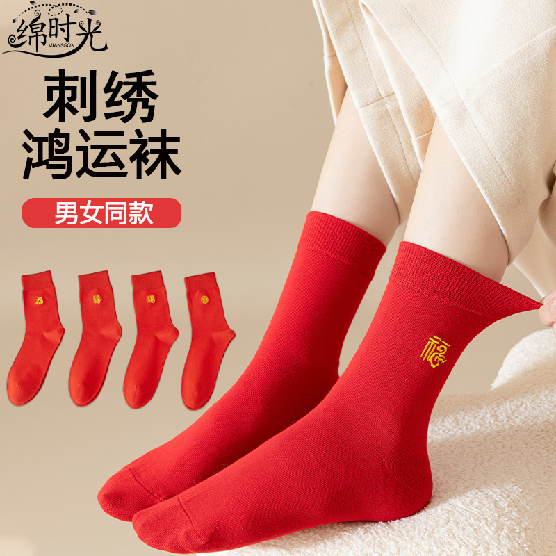 大红袜子男女新年结婚冬季喜庆本命年红色袜子保暖刺绣款中筒红袜