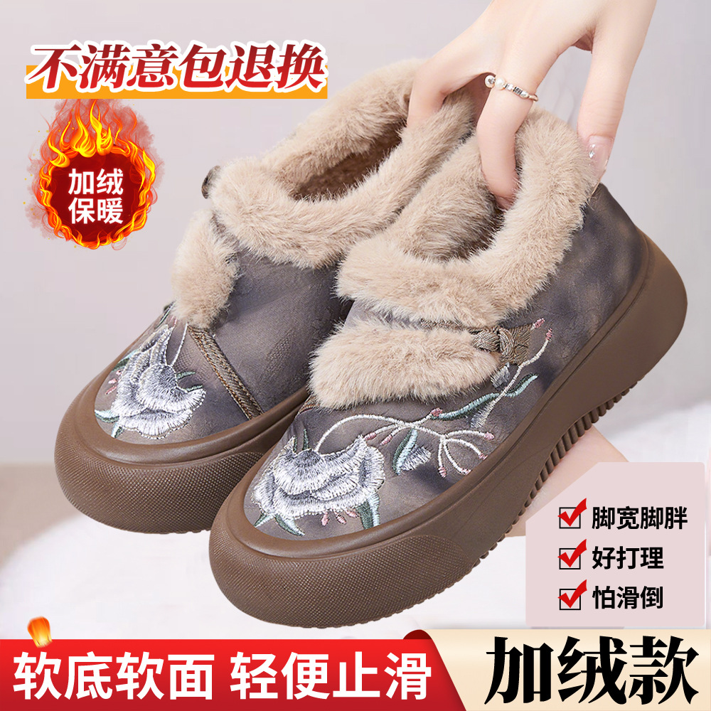 2025冬季新款老北京布鞋女民族风加绒古风汉服鞋子软底绣花鞋棉鞋