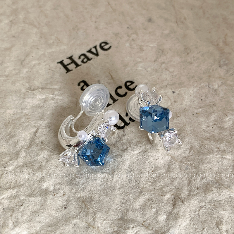 高级感蓝方糖水晶珍珠耳钉女小众独特精致显白时尚耳环耳夹无耳洞