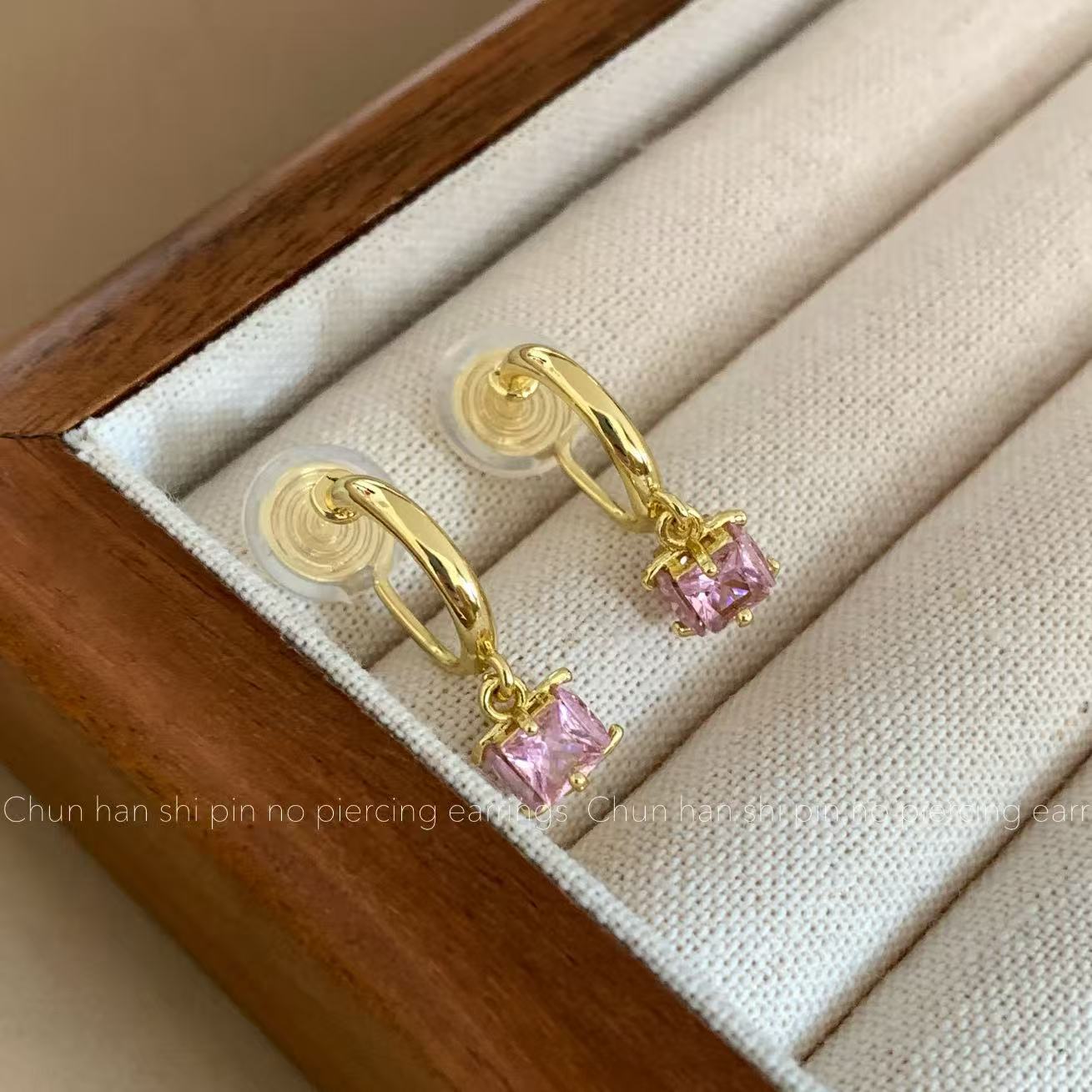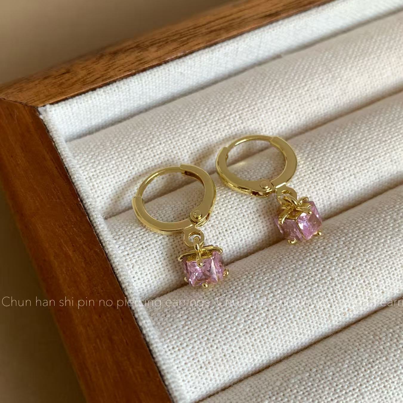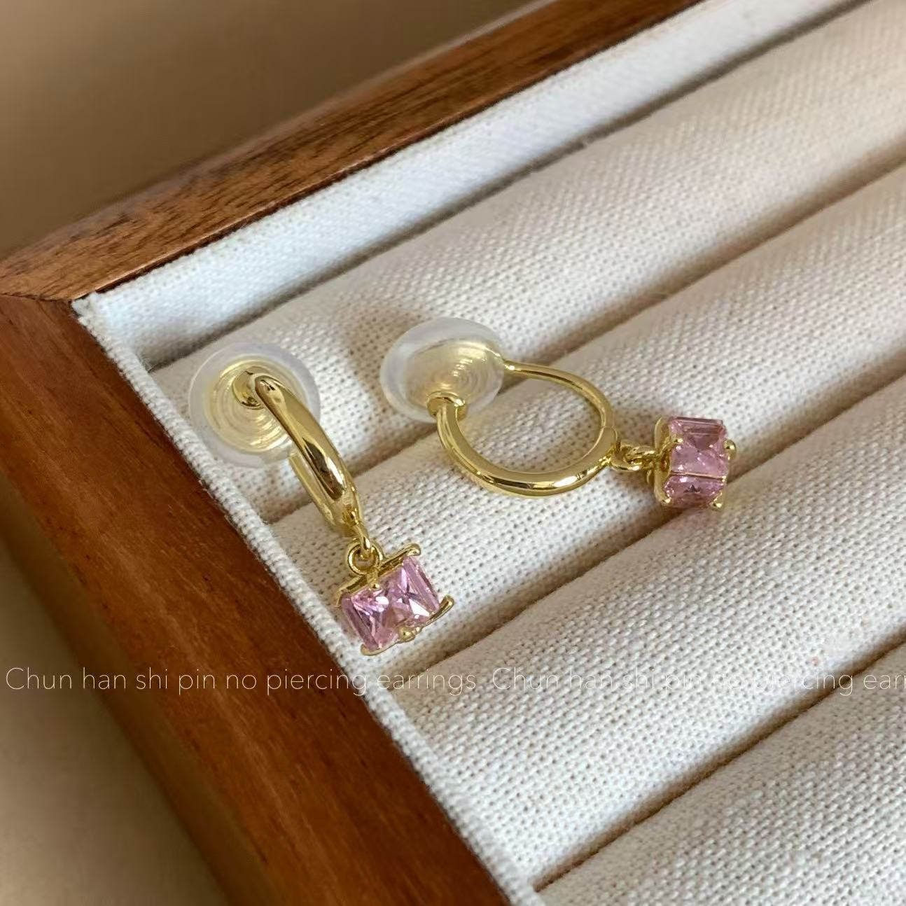 粉色方形锆石耳钉轻奢高级感耳饰耳圈耳环一体式蚊香盘耳夹无耳洞