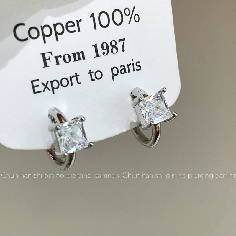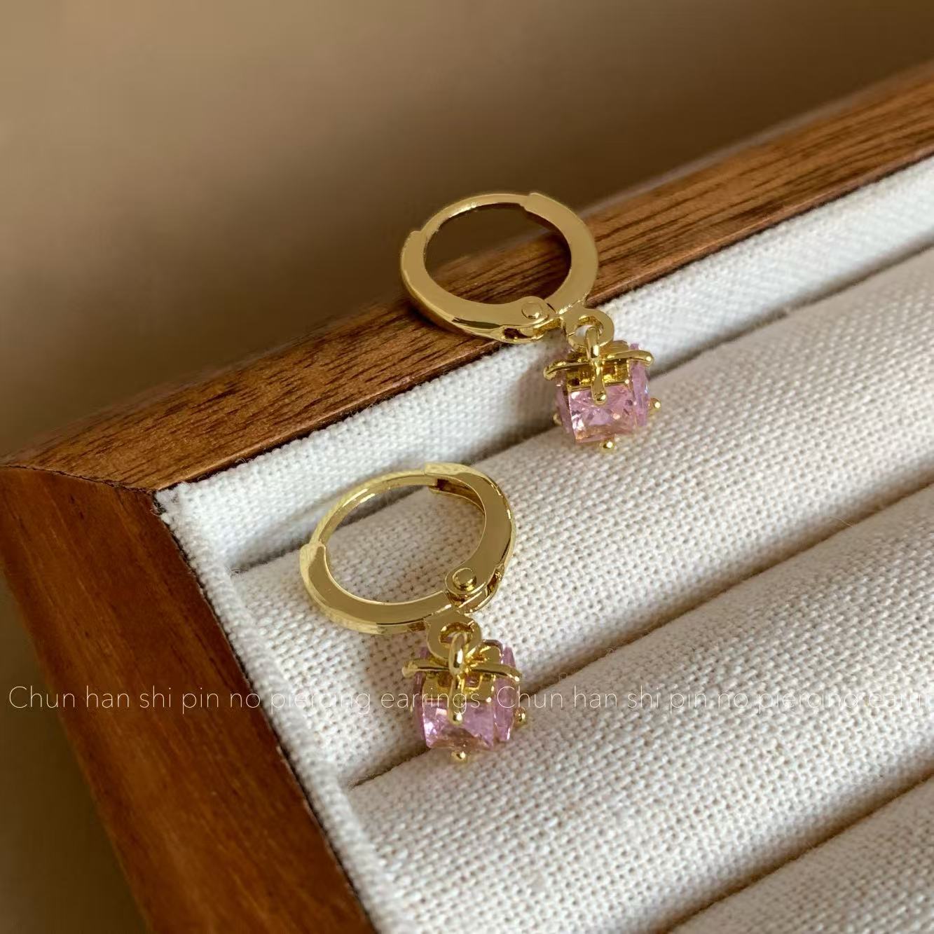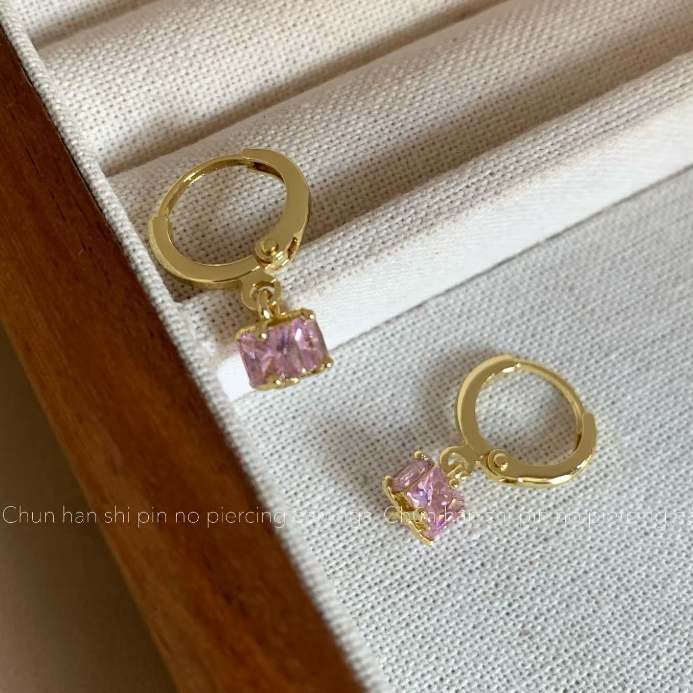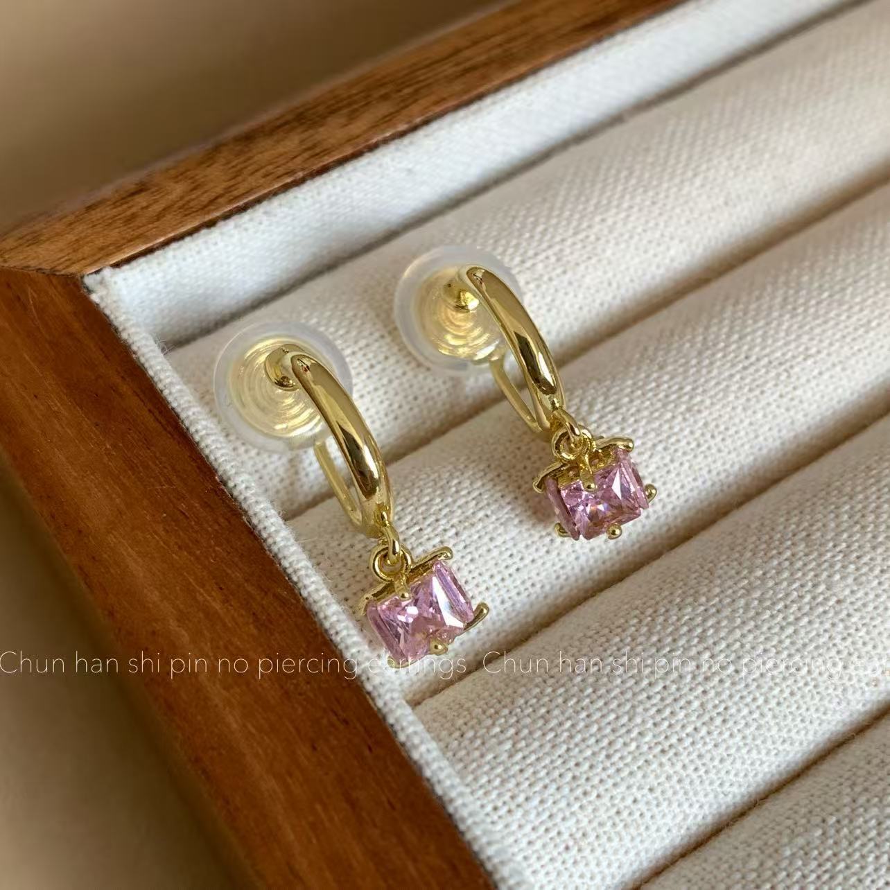 粉色方形锆石耳钉轻奢高级感耳饰耳圈耳环一体式蚊香盘耳夹无耳洞