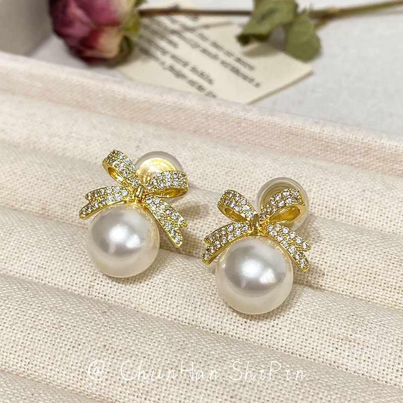 フレンチレトロ赤い蝶結び人工真珠ピアス秋冬新年ピアス穴なし高級感大衆イヤリング