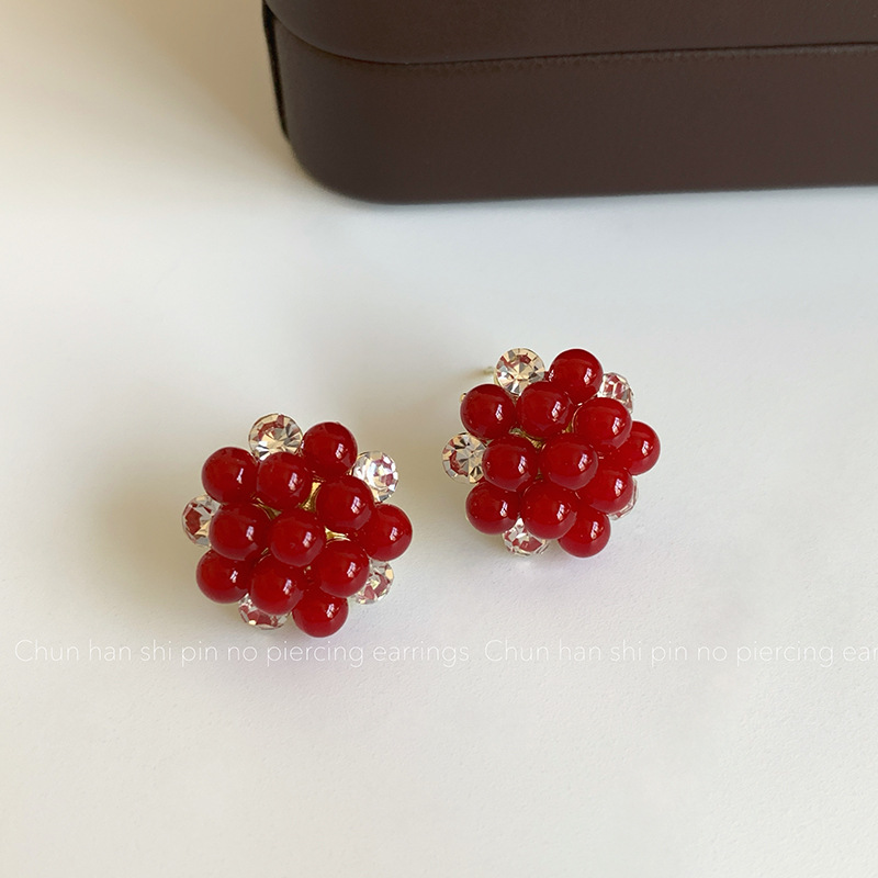 红色珍珠闪钻耳钉复古百搭锆石耳环精致时尚轻奢高级感耳夹无耳洞