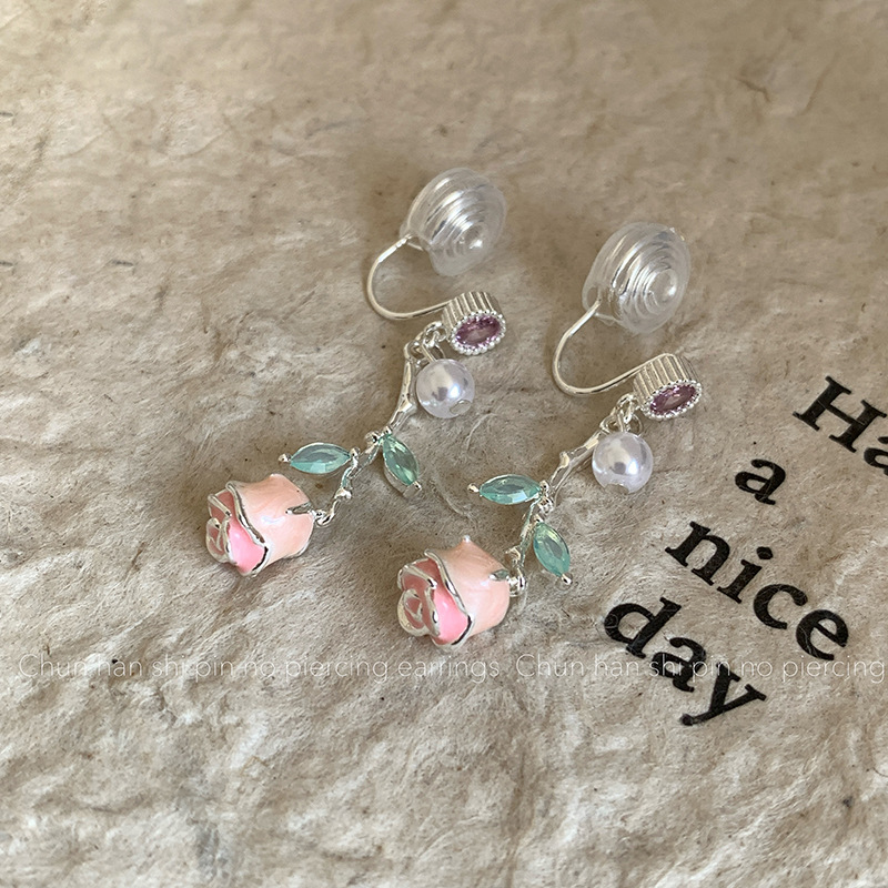 粉色玫瑰珍珠耳钉女锆石流苏长款耳环耳夹蚊香盘耳饰轻奢高级感