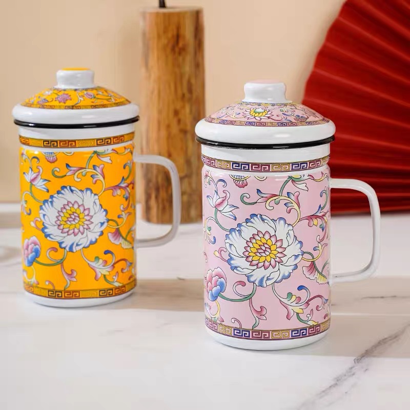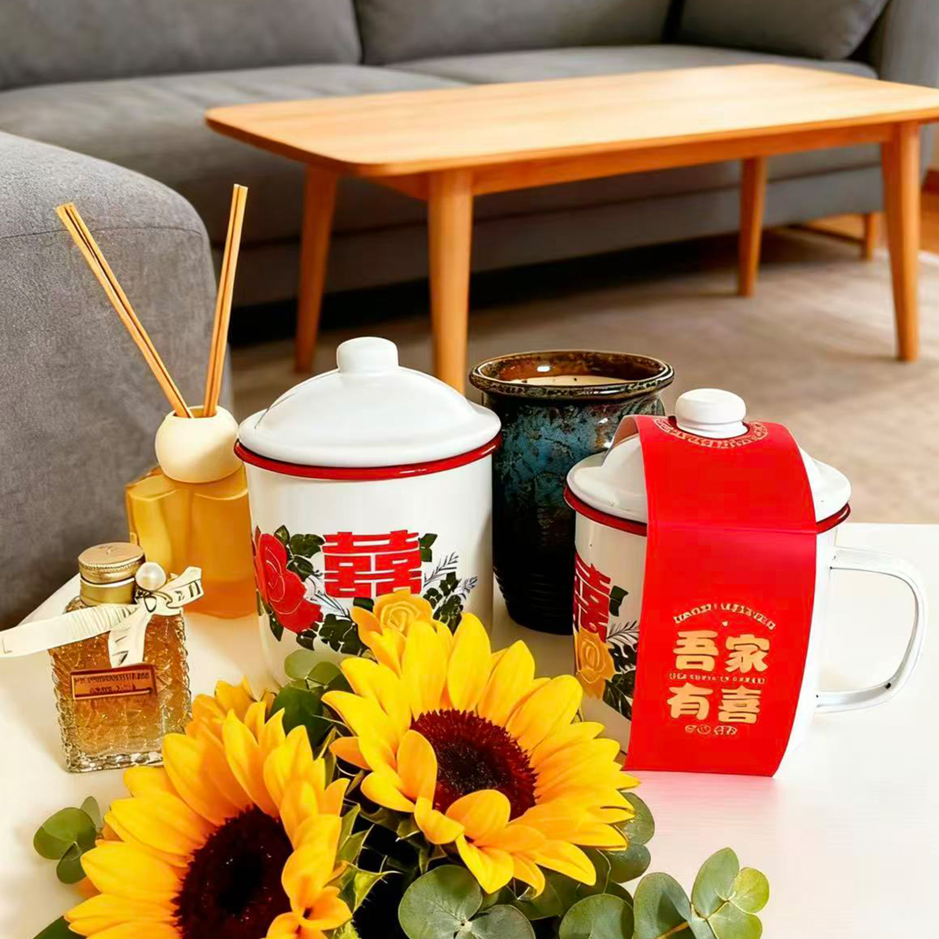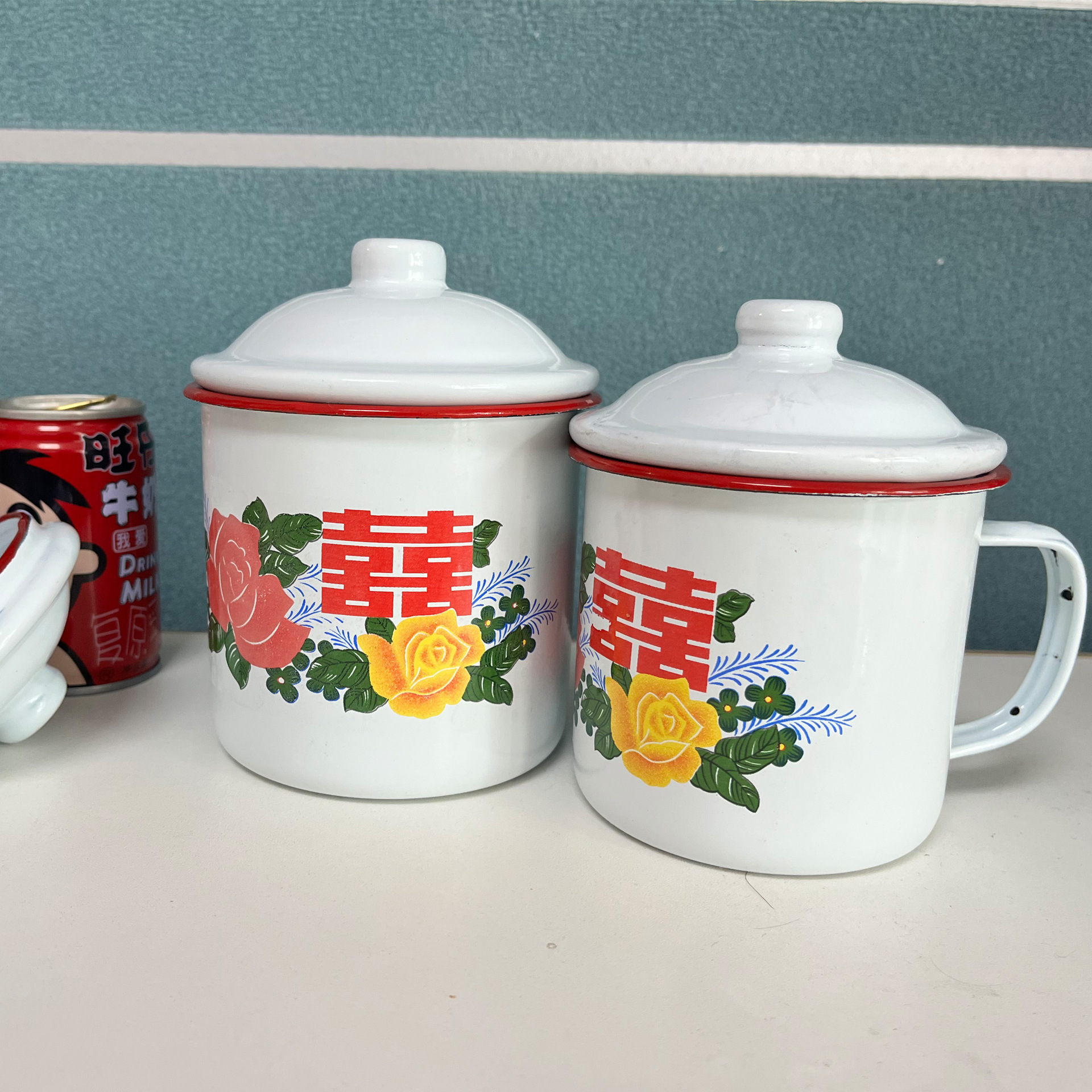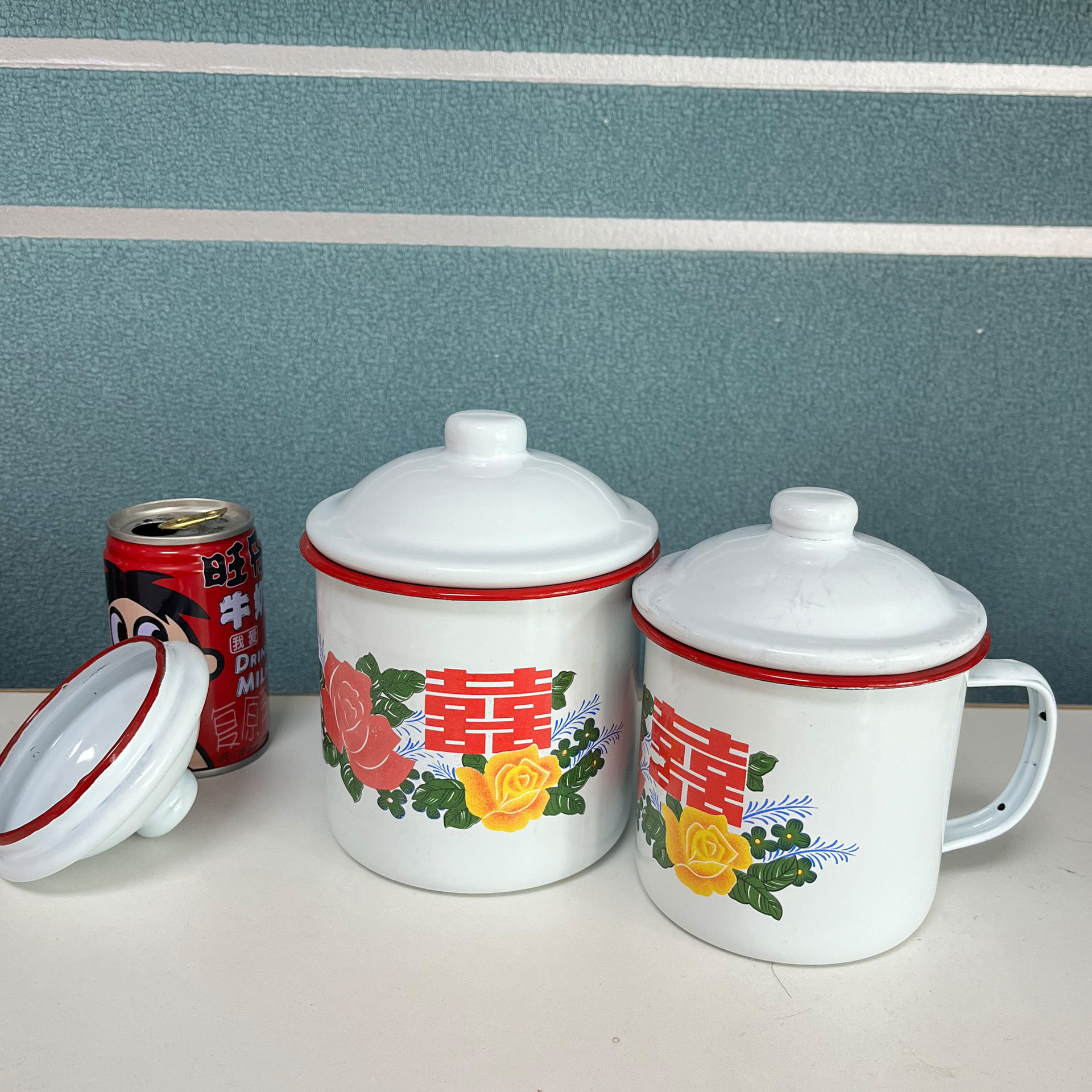 双喜花卉款搪瓷杯复古马克杯喜糖杯新款喜糖盒带盖茶杯搪瓷杯茶缸