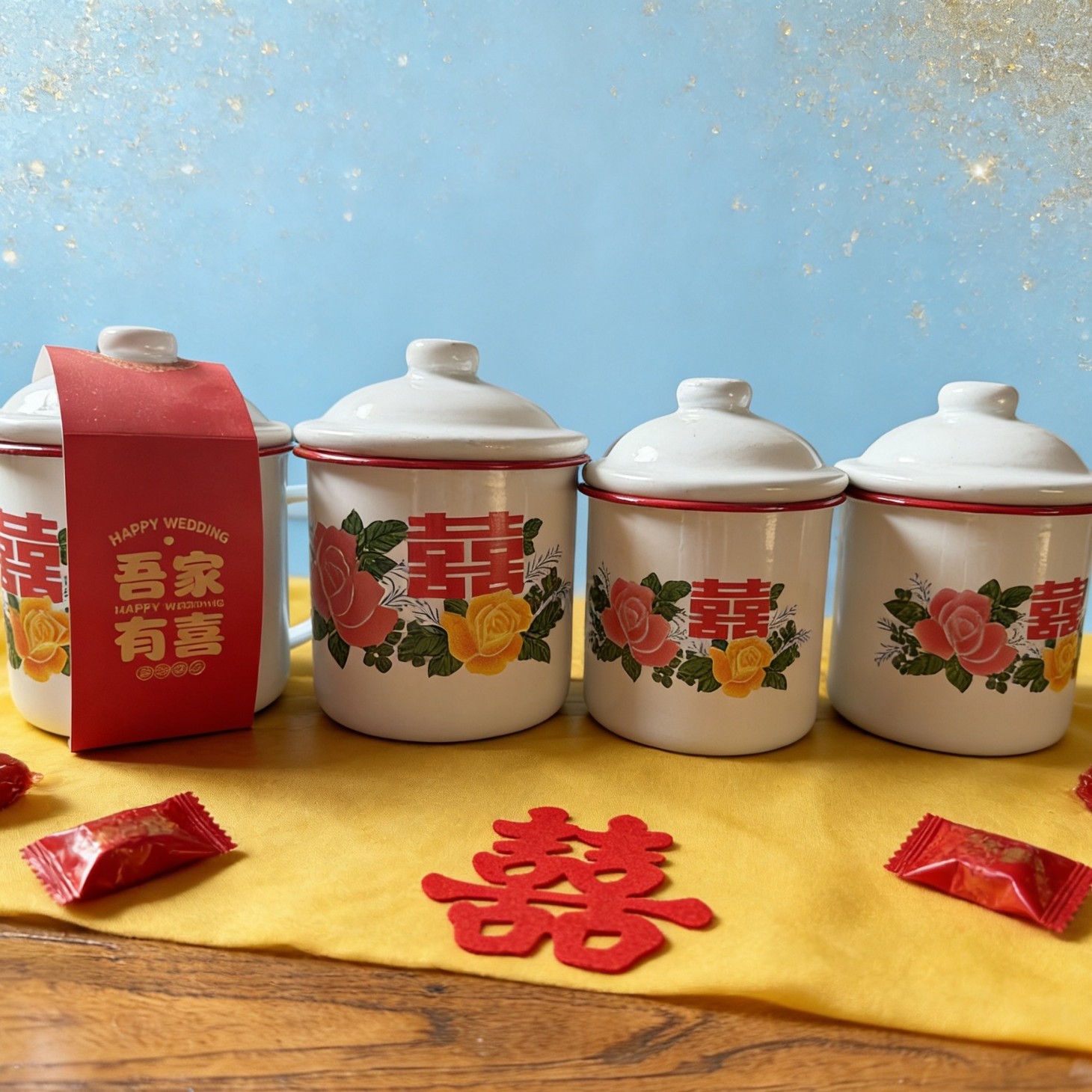 紅双喜エナメルカップ 赤い蓋付き鉄製茶壺 結婚式用 レトロマグカップ 紅双喜 結婚式のお祝い