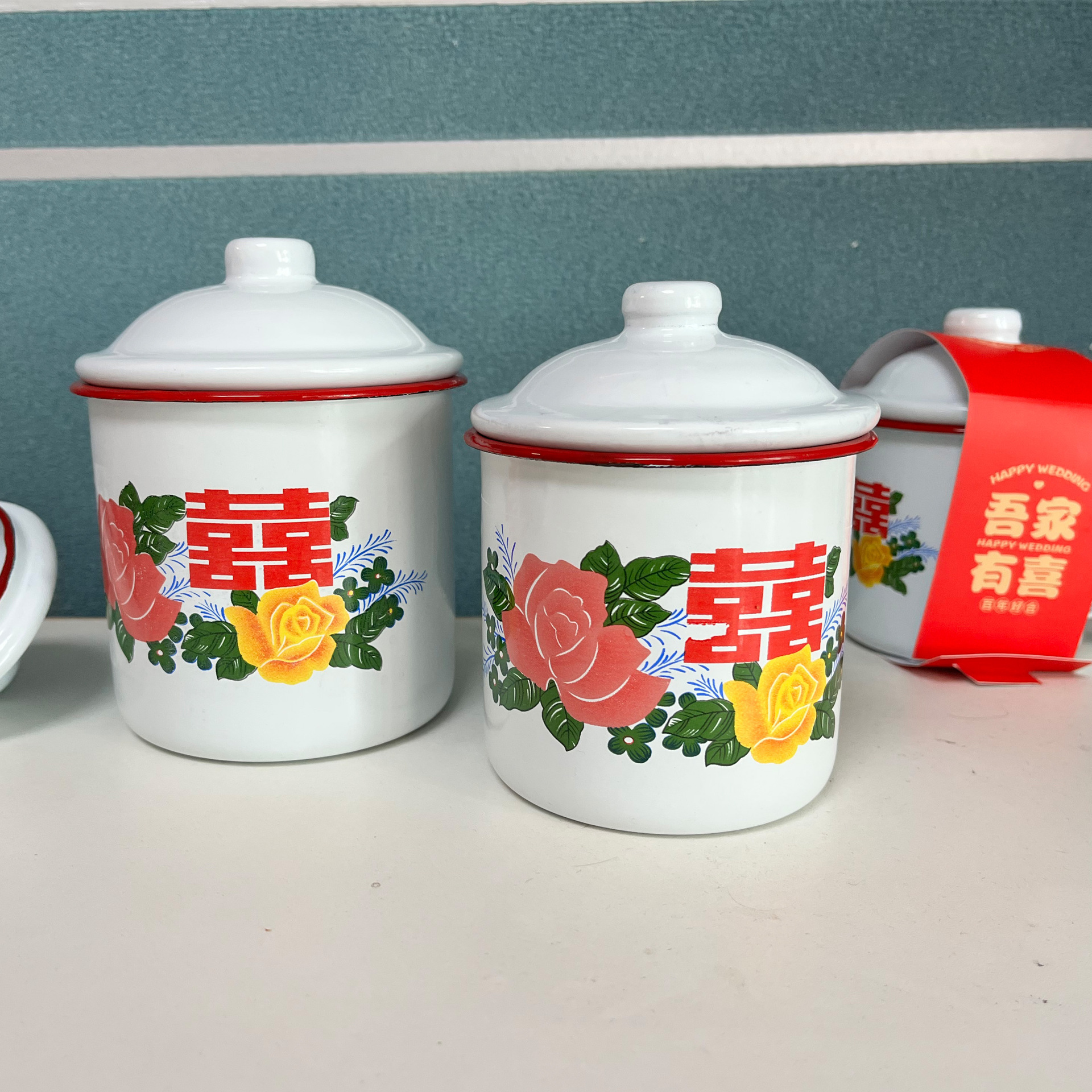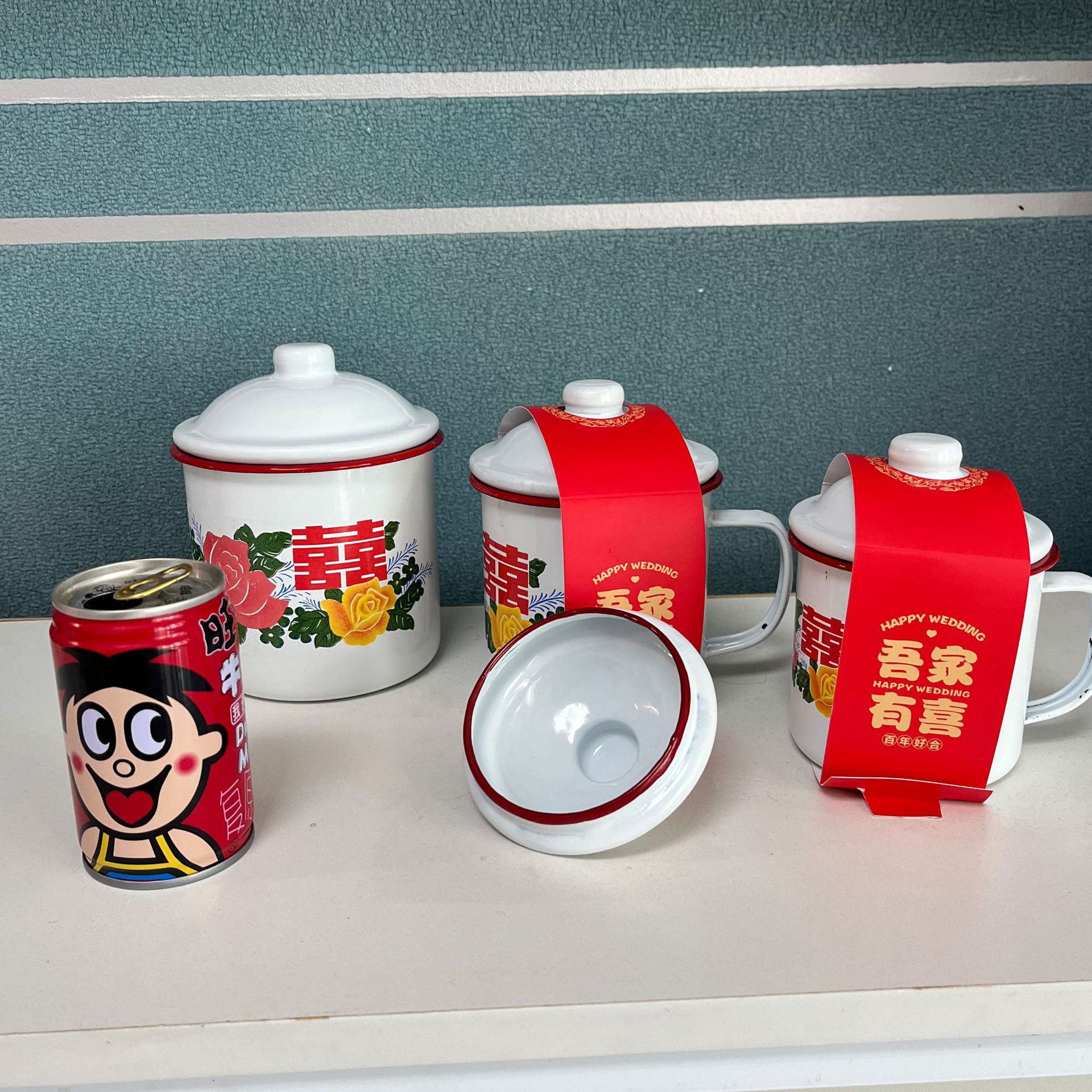 新款双喜款搪瓷杯红边喜糖杯复古搪瓷喜糖盒搪瓷茶缸喜礼双喜糖杯