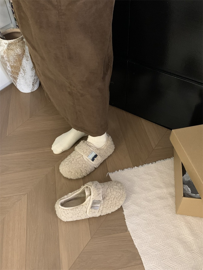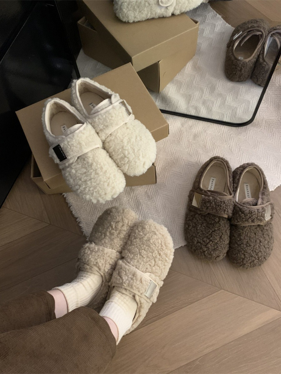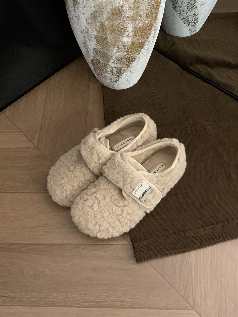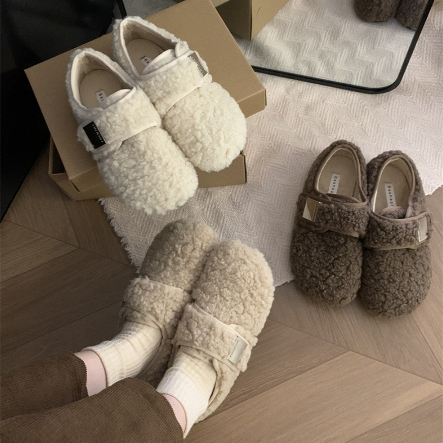 羊羔毛毛鞋女秋冬外穿2025年新款复古魔术贴单鞋女平底豆豆鞋加绒