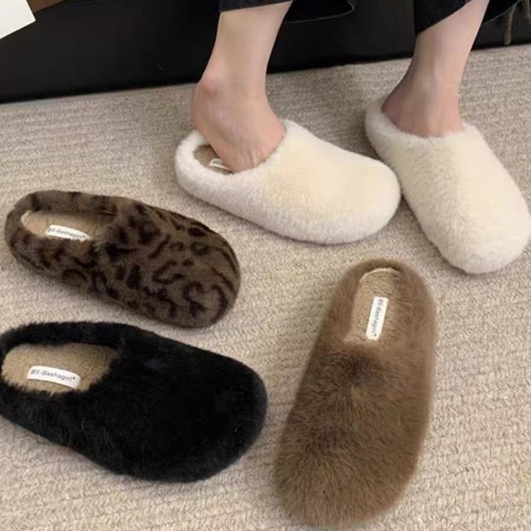 毛毛鞋女冬外穿新款网红豹纹博肯毛毛拖厚底包头内增高3厘米棉拖