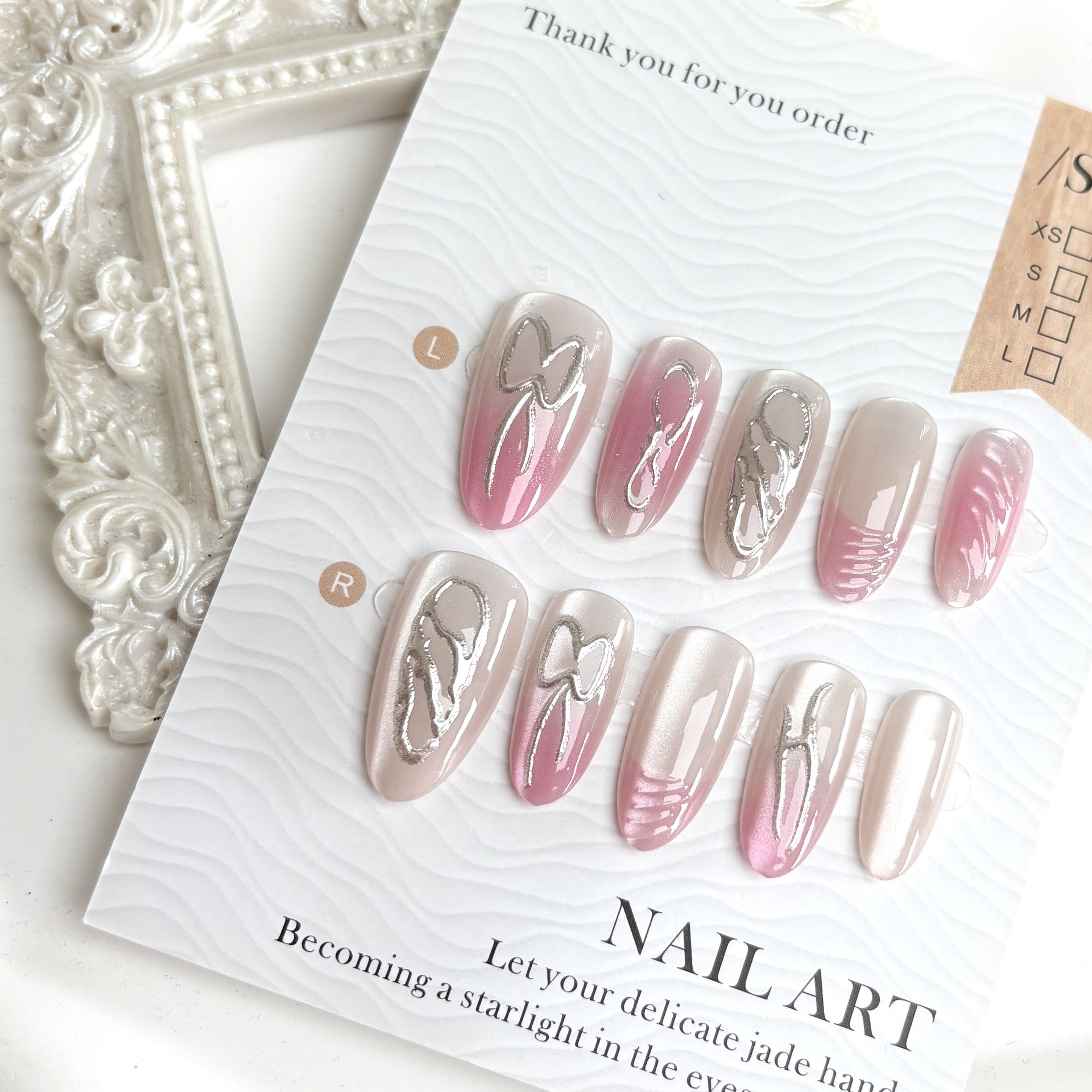 ピンクの蝶結びinsのチークと金のグラデーションは甲の猫の目の春の日を着て白い韓国系のネイルシールを見せます。