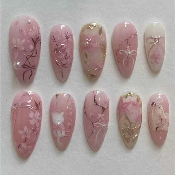粉色樱花小猫欧美美甲贴片假指甲跨境穿戴甲批发欧美带钻nails