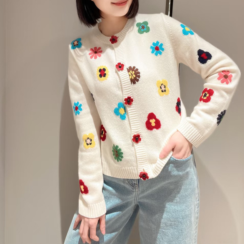 现货 鄂系风2026春季彩色花朵针织开衫女圆领单排扣温柔风毛衣