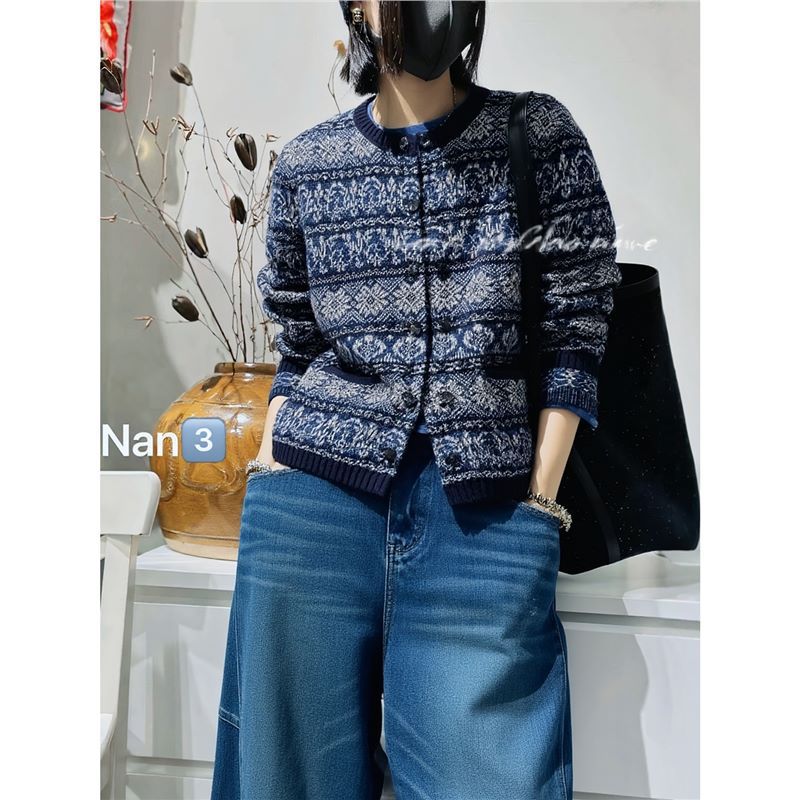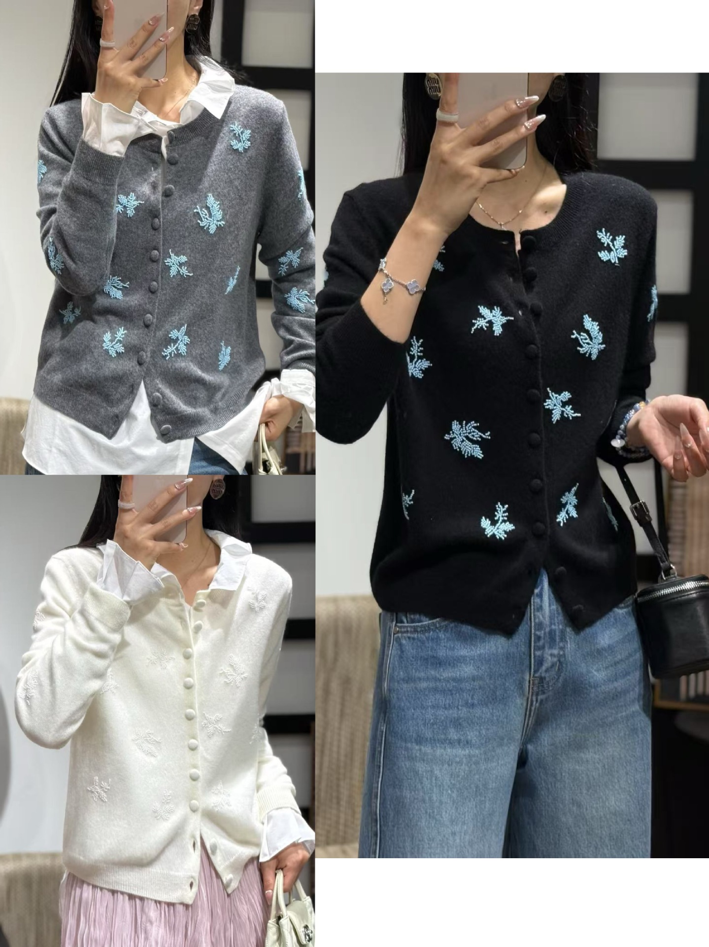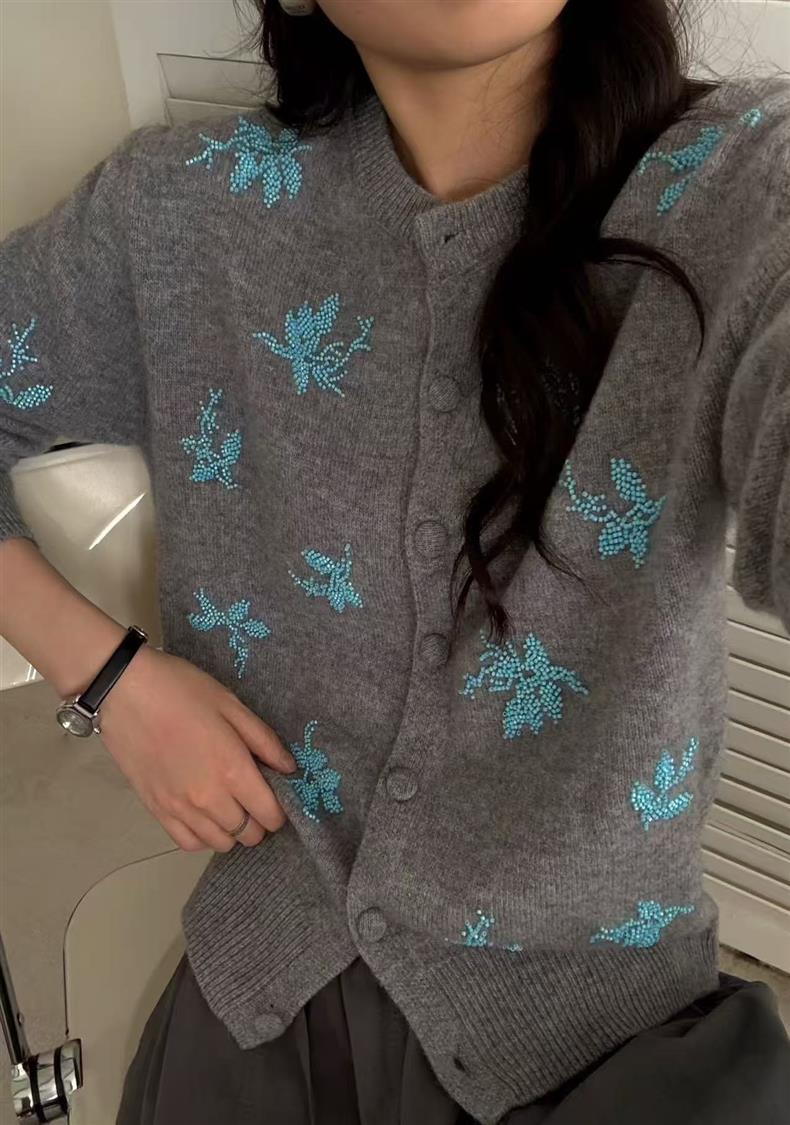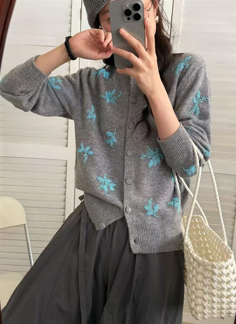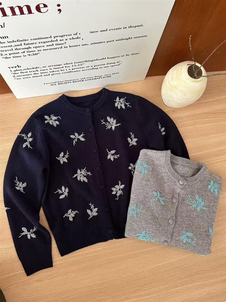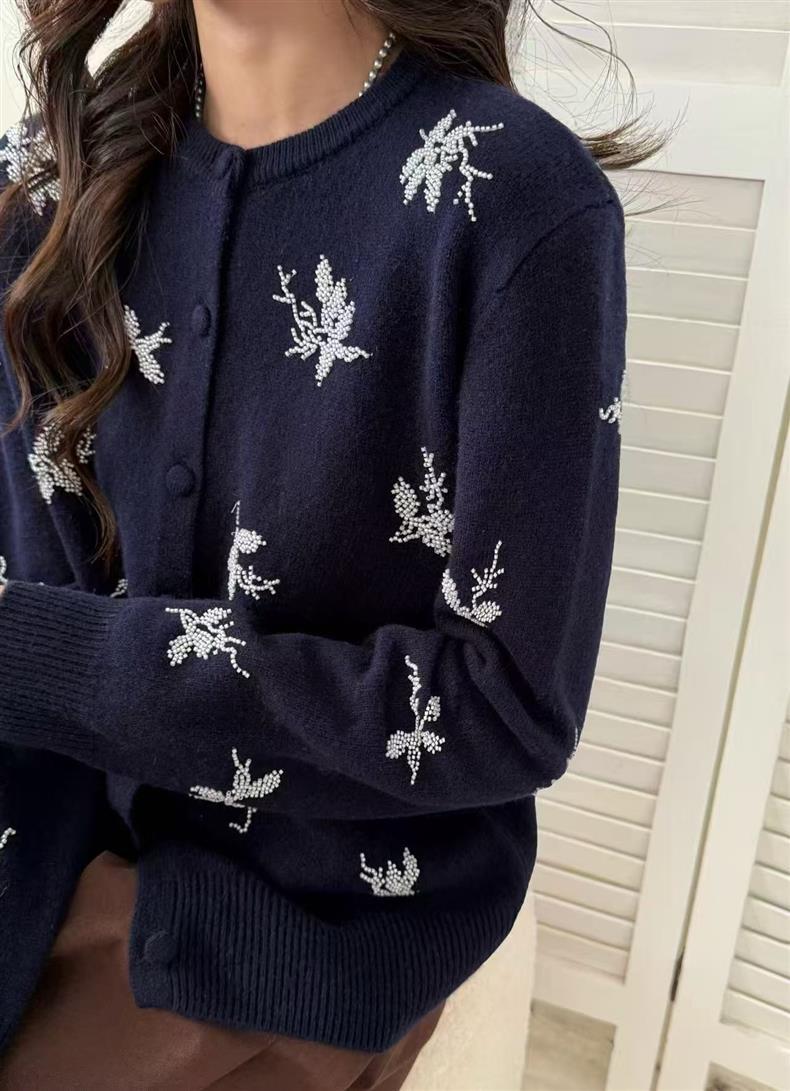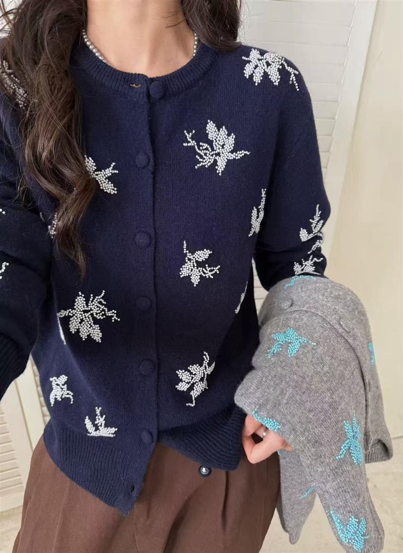 2025早秋新款刺绣串珠100%羊毛针织开衫女时尚气质圆领长袖外套女