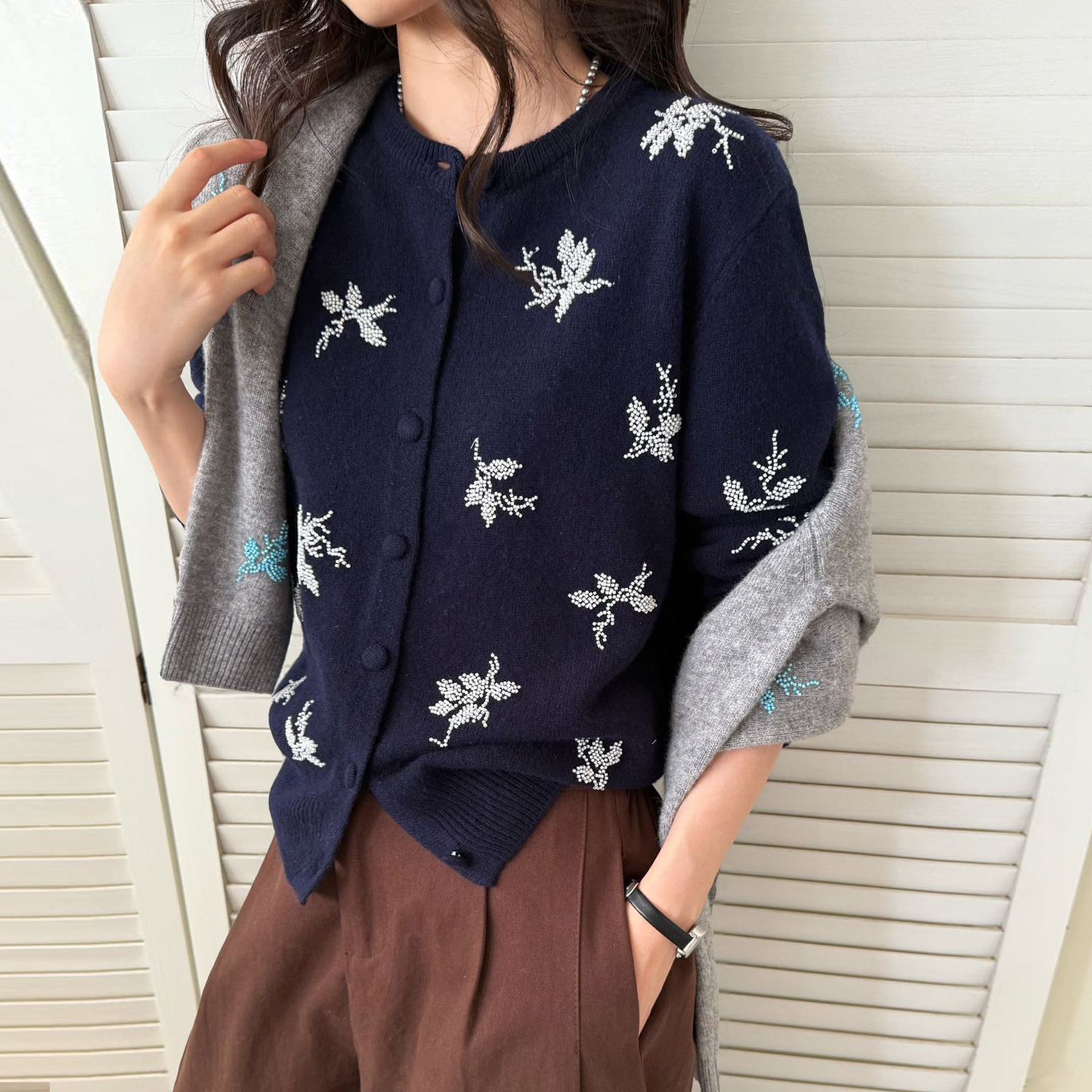 秀而羊毛馆2025早秋新款圆领单排扣休闲刺绣串珠针织羊毛开衫