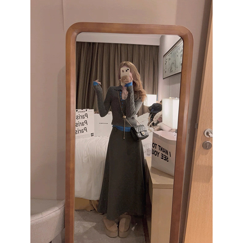 灰色中长款高腰半身裙女秋冬韩系修身显瘦大摆a字裙