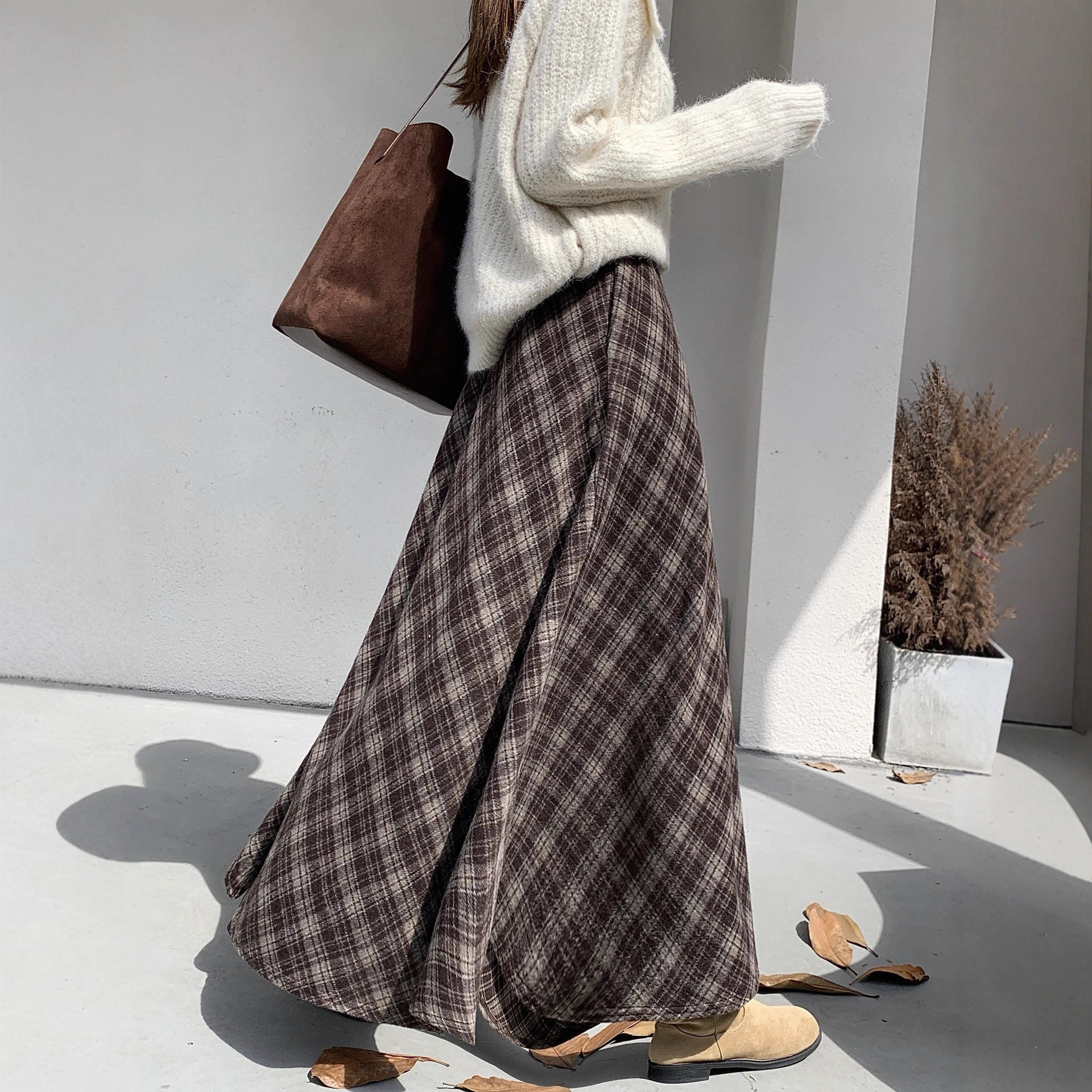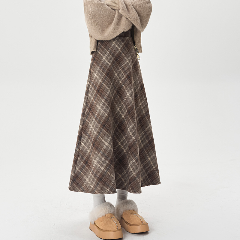 咖色格子毛呢半身裙女秋冬美式复古大摆伞裙高腰显瘦中长款字裙