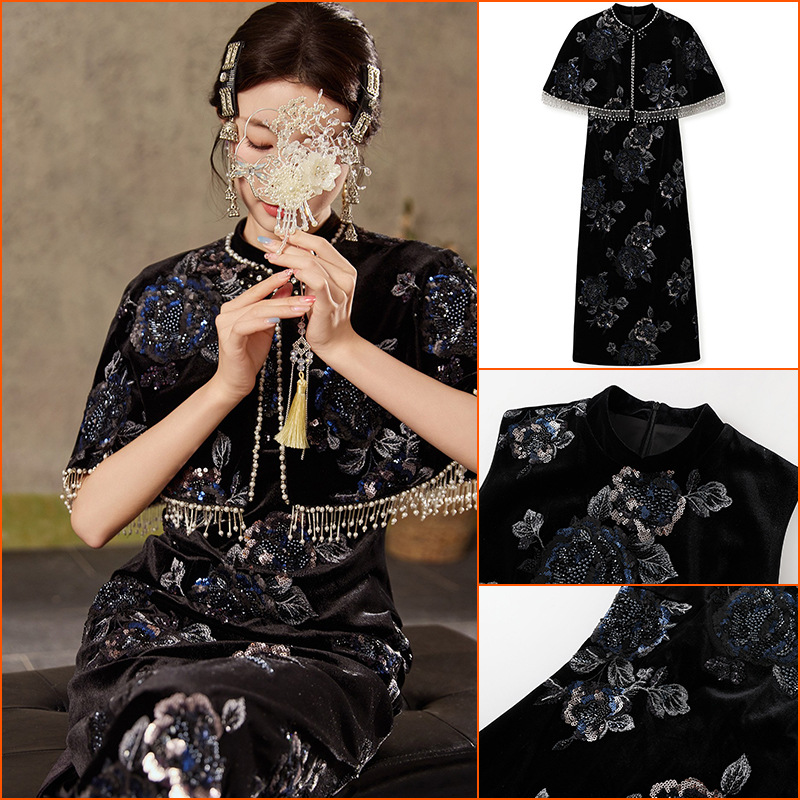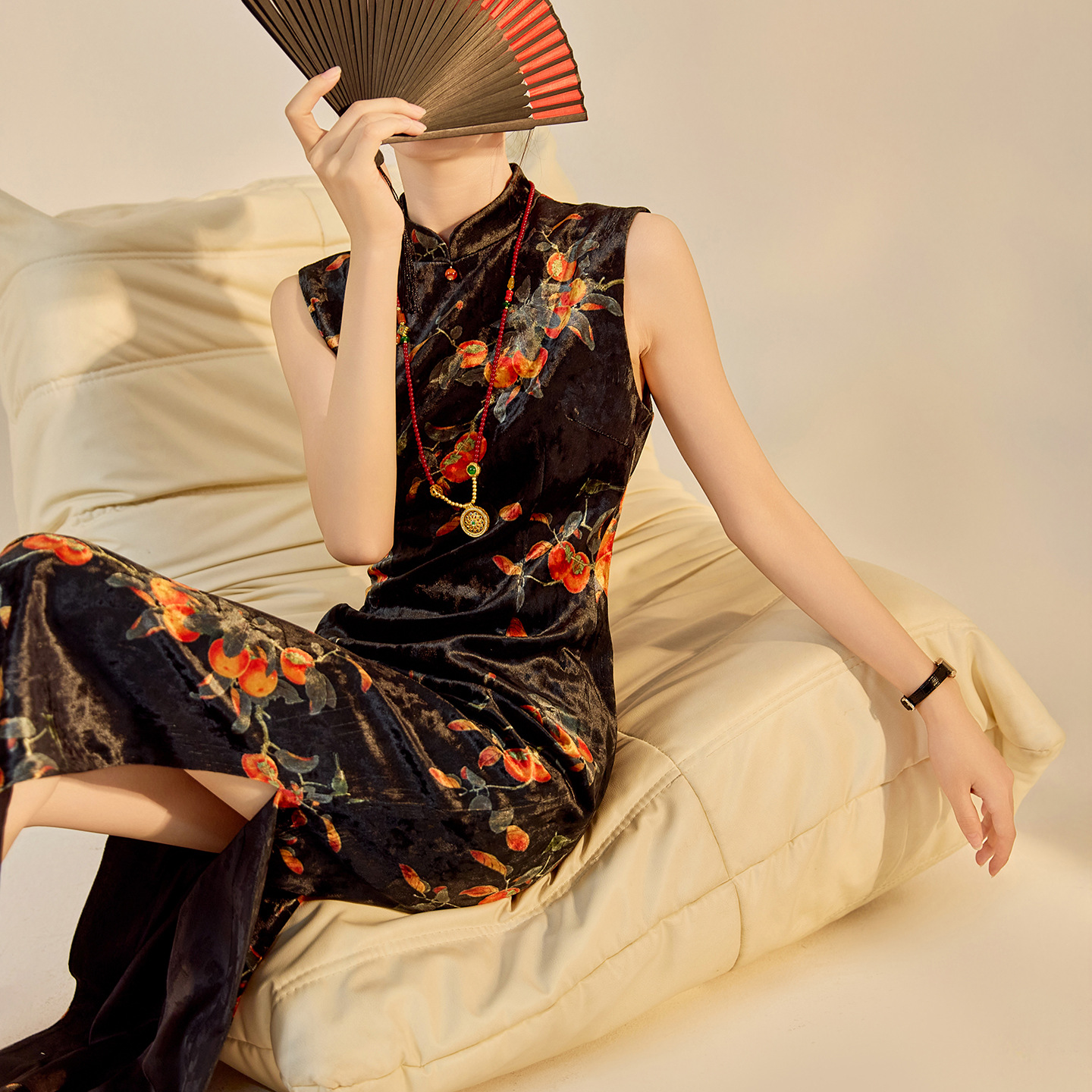 新中式黑色丝绒时尚无袖中式旗袍裙早秋立领简约设计连衣裙 N8025