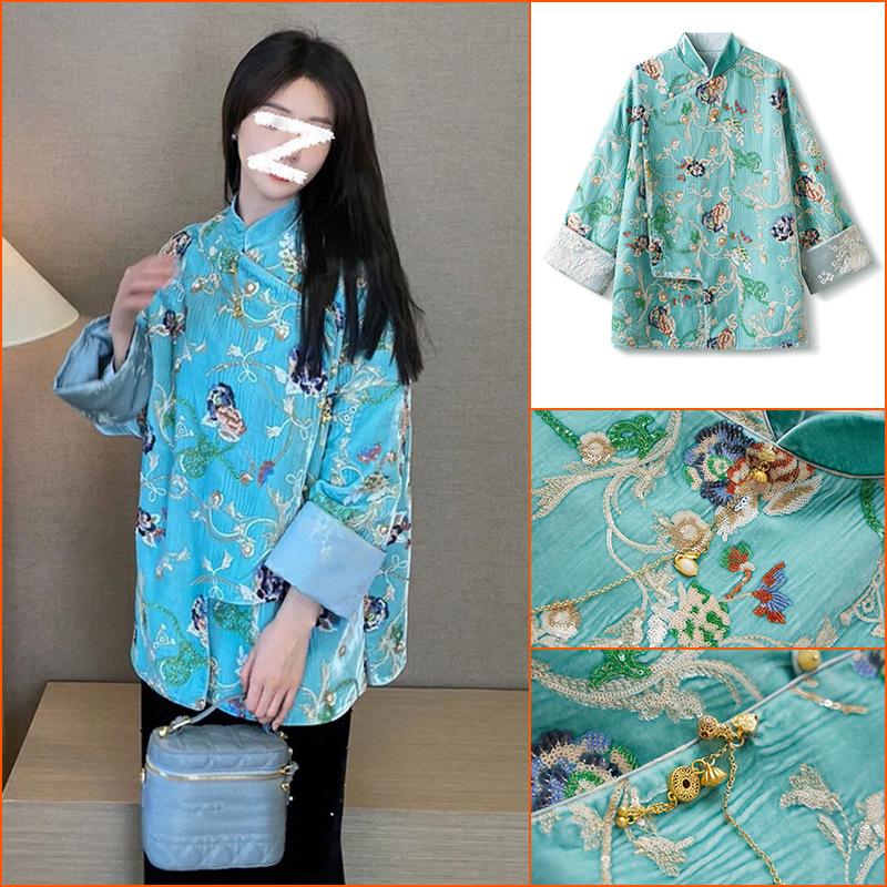 秋冬新作 新中式ベルベットボタン付きトップス 国風刺繍スパンコールグリーンコットンジャケット M3016