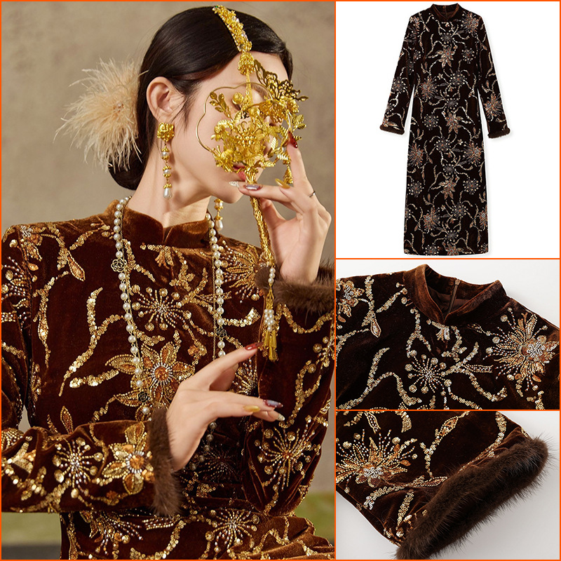 秋冬新款气质旗袍改良连衣裙国风刺绣钉珠水貂毛显瘦长裙女 NX029