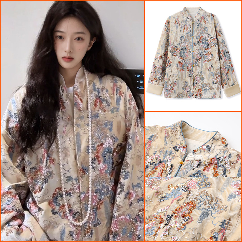 2025新型国風デザイン感コート女性冬新中国式重工スパンコール刺繍流行綿服M8117