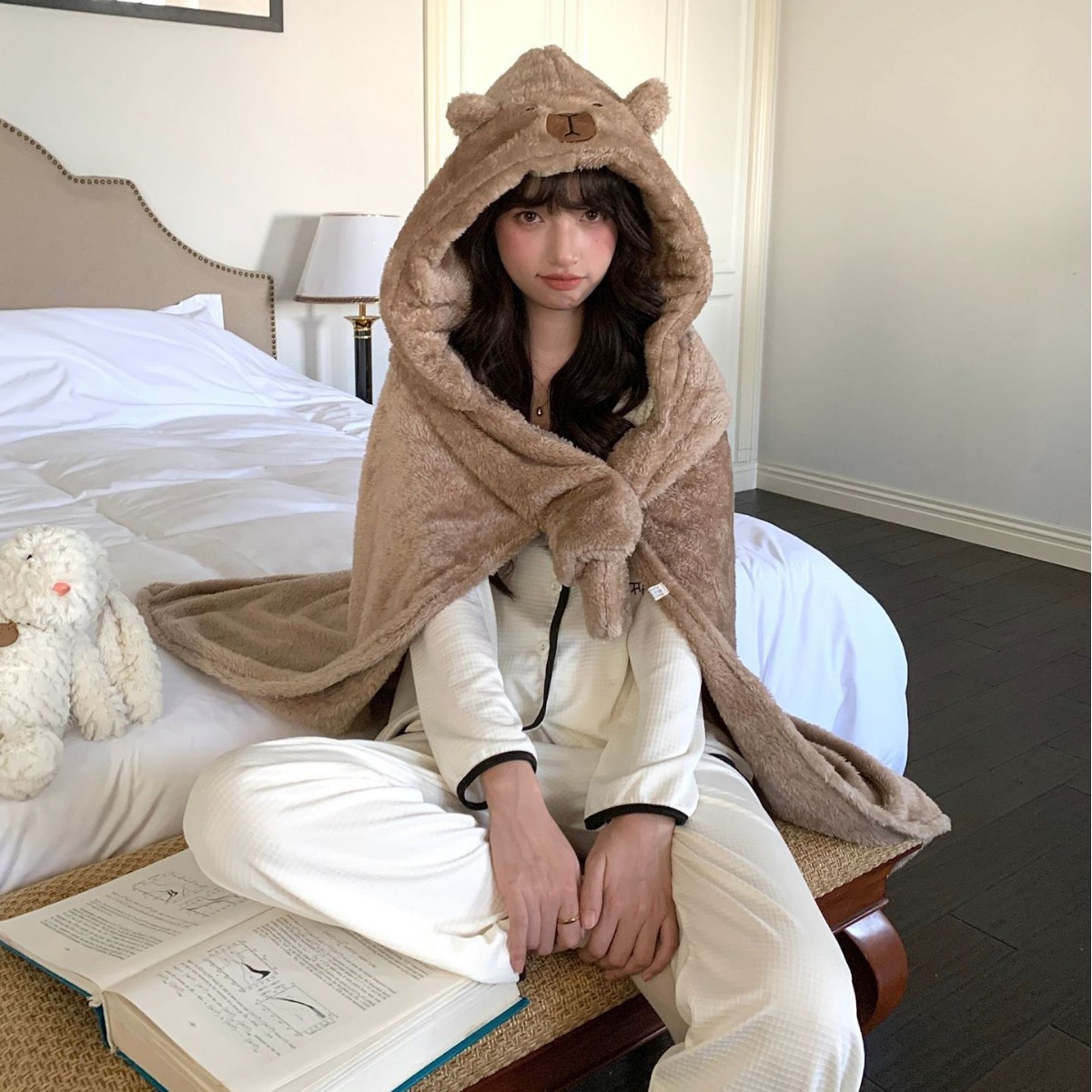 アニメ熊かわいい秋冬厚手保温毛布ストール帽子付き学生昼寝毛布マント式