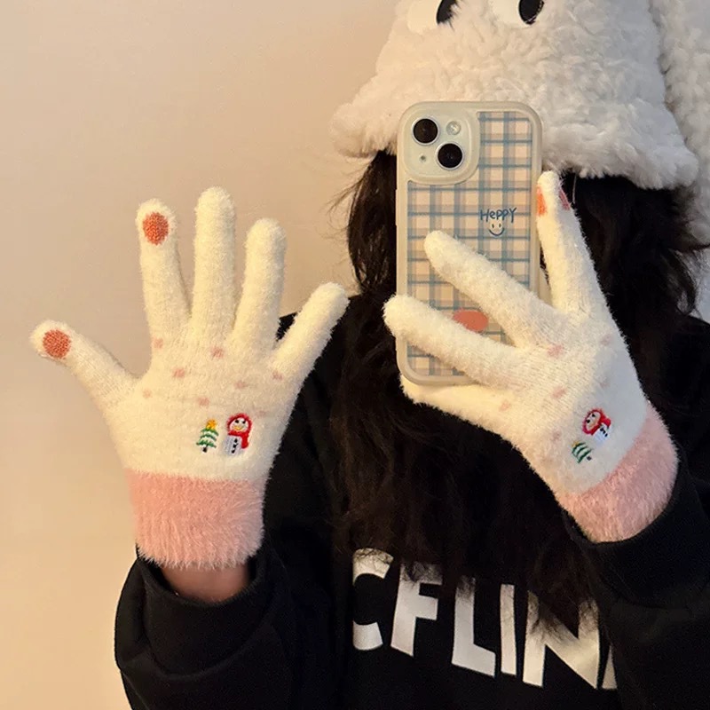 韓国風ニット手袋 冬用 サイクリング 防寒 女の子向け 可愛い タッチスクリーン対応 防寒 雪だるま柄 ウール手袋