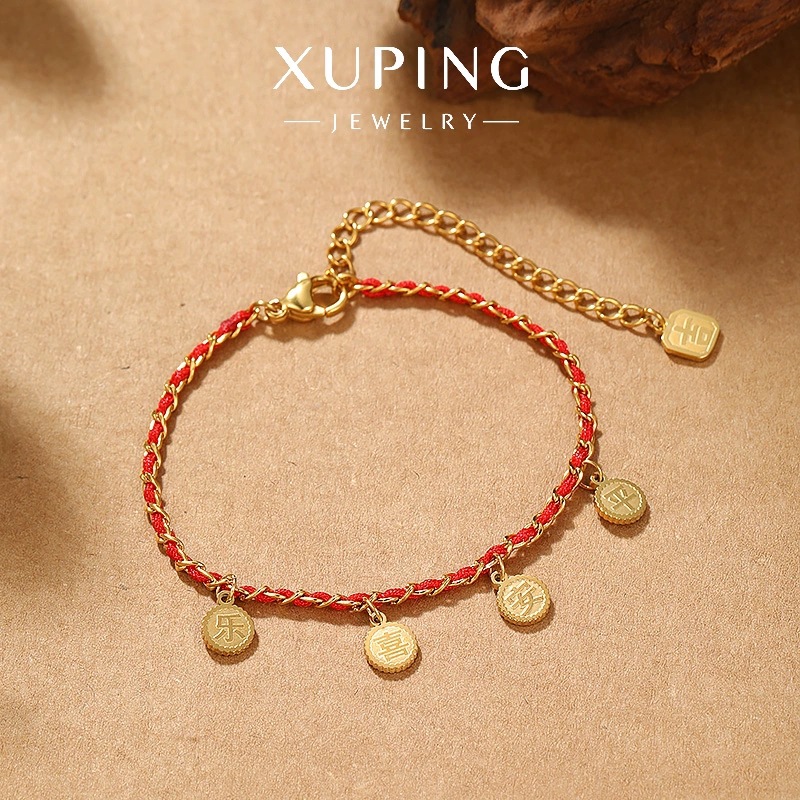 旭平 福牌红色编织手链不锈钢镀24k色小众设计气质新年手饰批发