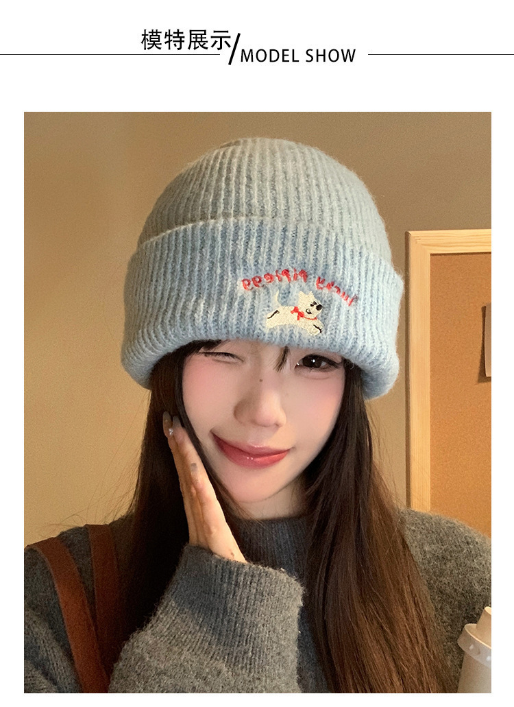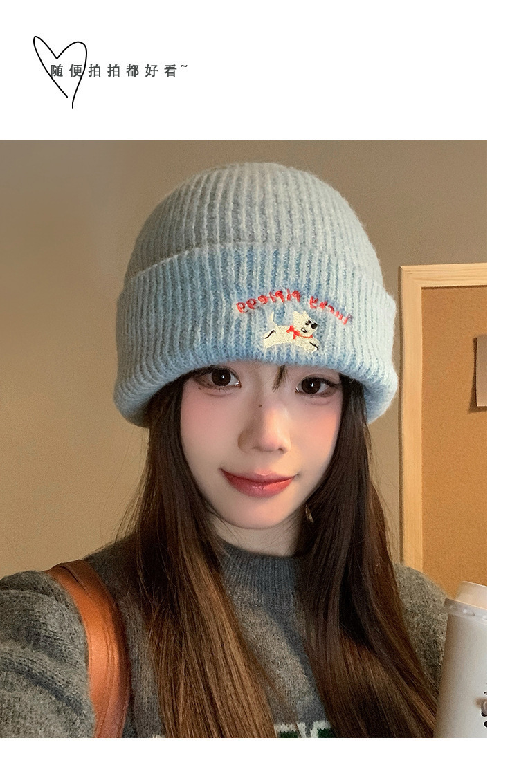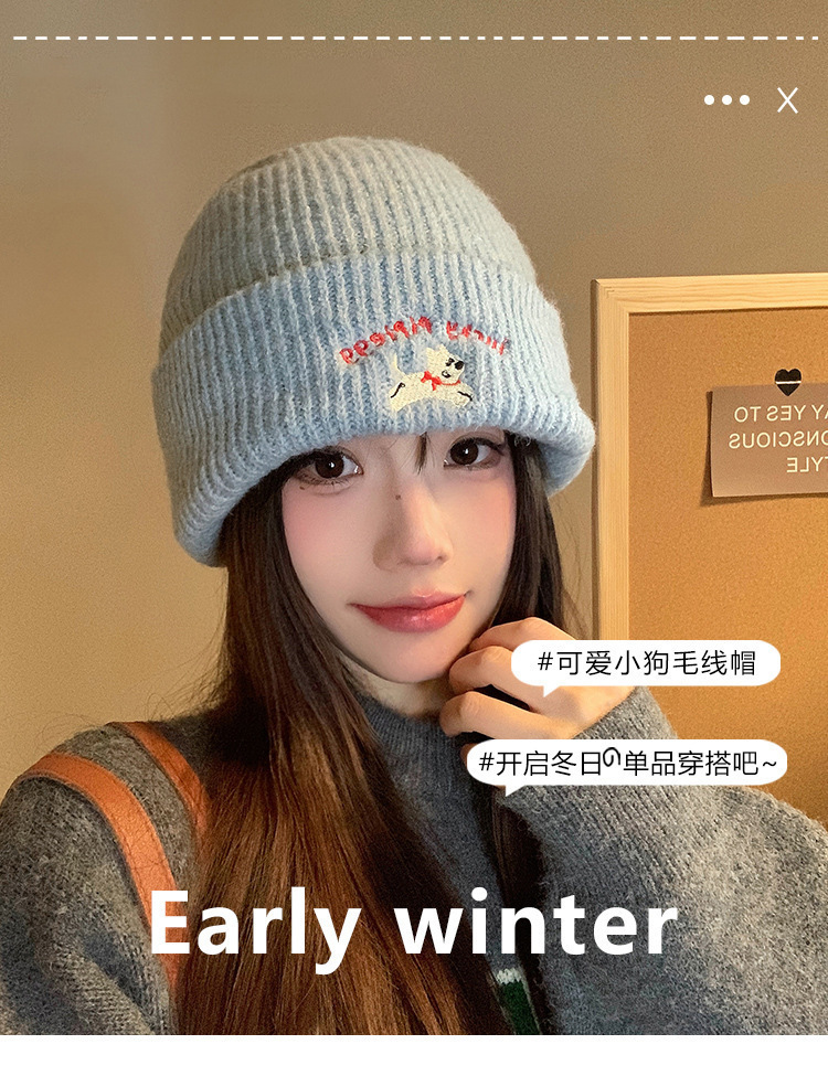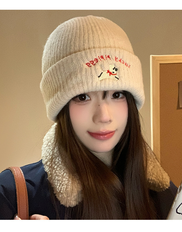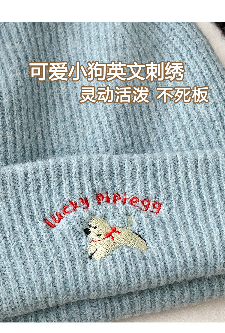 韩系可爱小狗刺绣标针织帽女款冬季保暖时尚百搭毛线帽护耳休闲帽