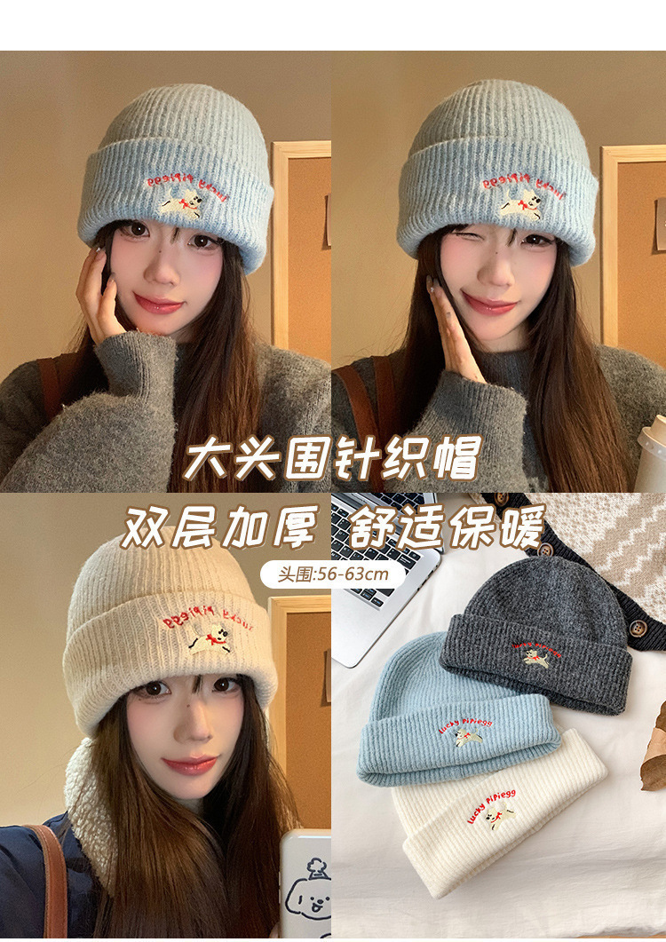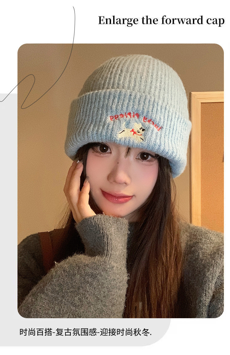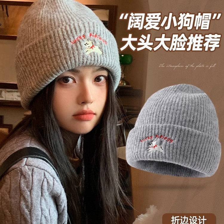 可爱小狗刺绣针织毛线帽女2025年新款秋冬季显脸小百搭大头围帽子