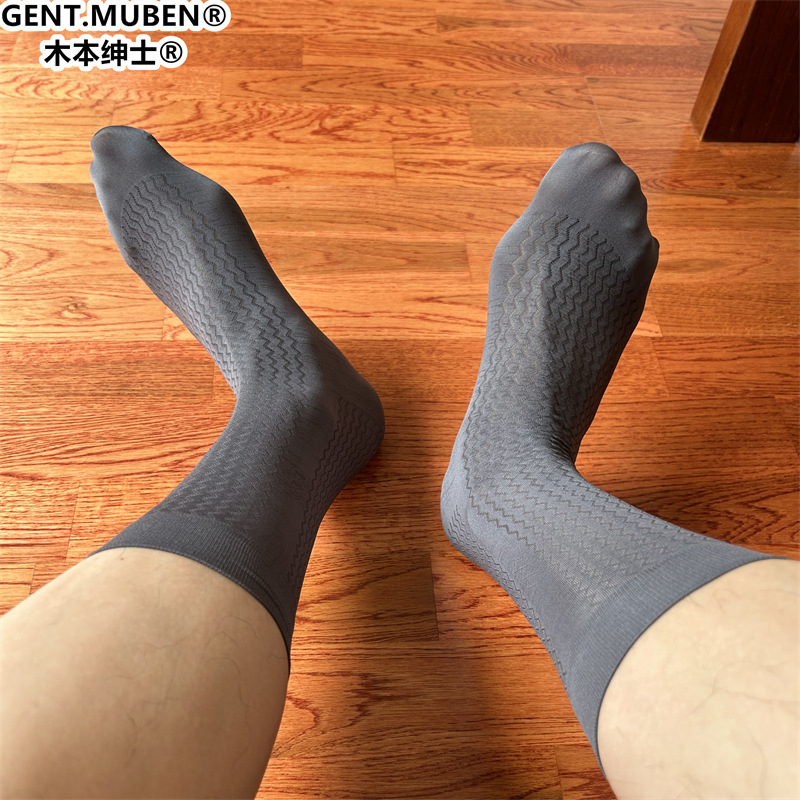 木本绅士新款波浪纹弯跟锦纶亮光丝男士商务休闲正装微透中筒丝袜