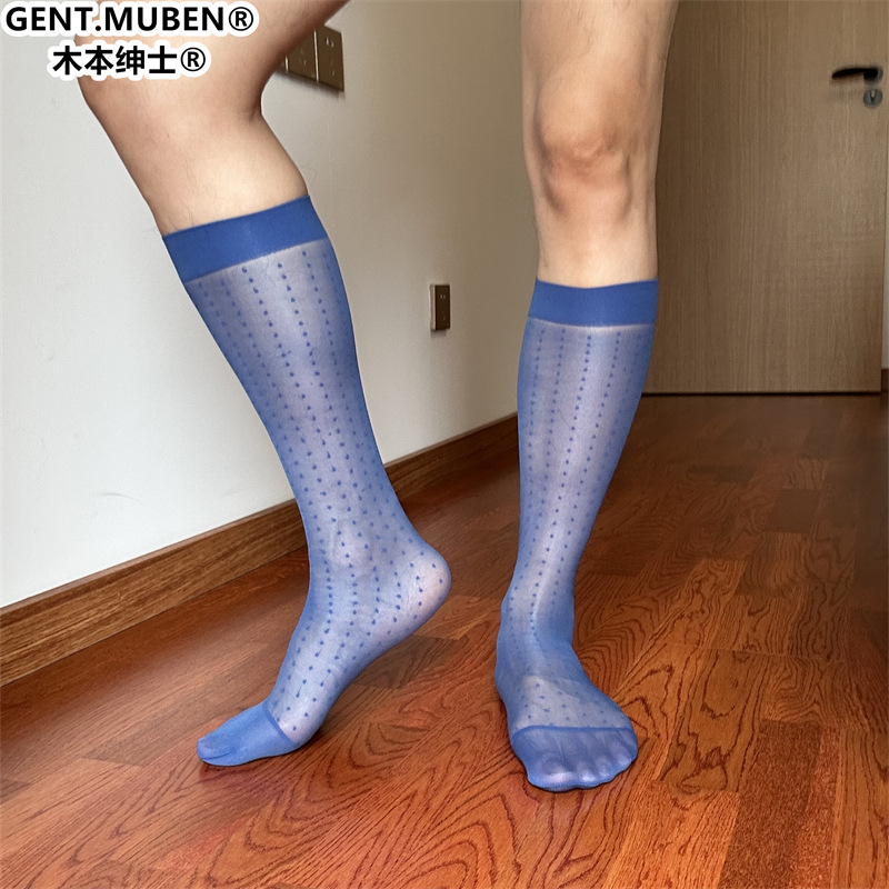 木本绅士密圆点宝蓝素面超薄平板透明男士商务西正装长筒锦纶丝袜