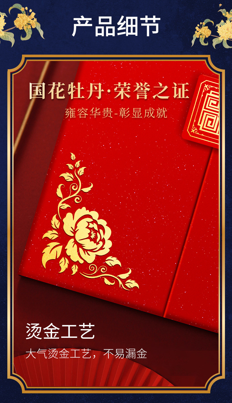 a4封面封皮国花牡丹获奖高级感三折页外壳套定制结业聘书荣誉证书