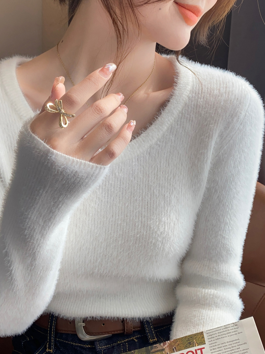 一体绒面料 针织衫V领内搭打底2025秋冬毛衣长袖加绒加厚保暖上衣