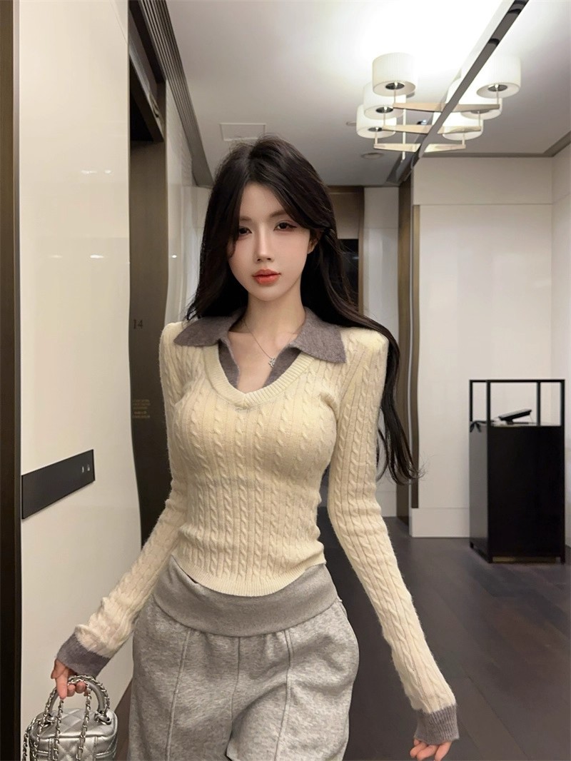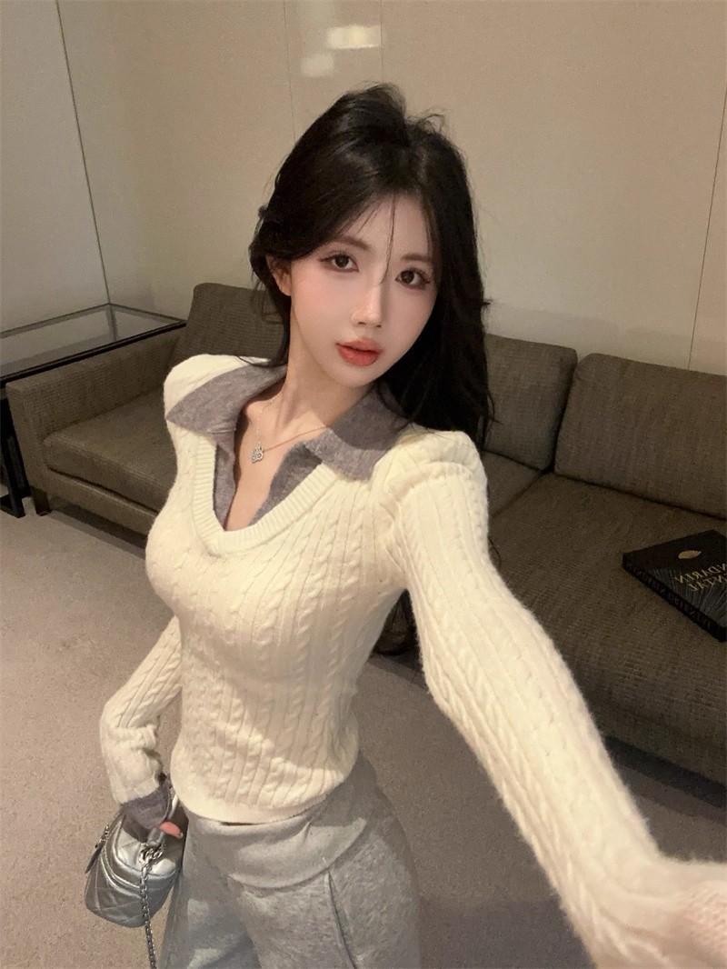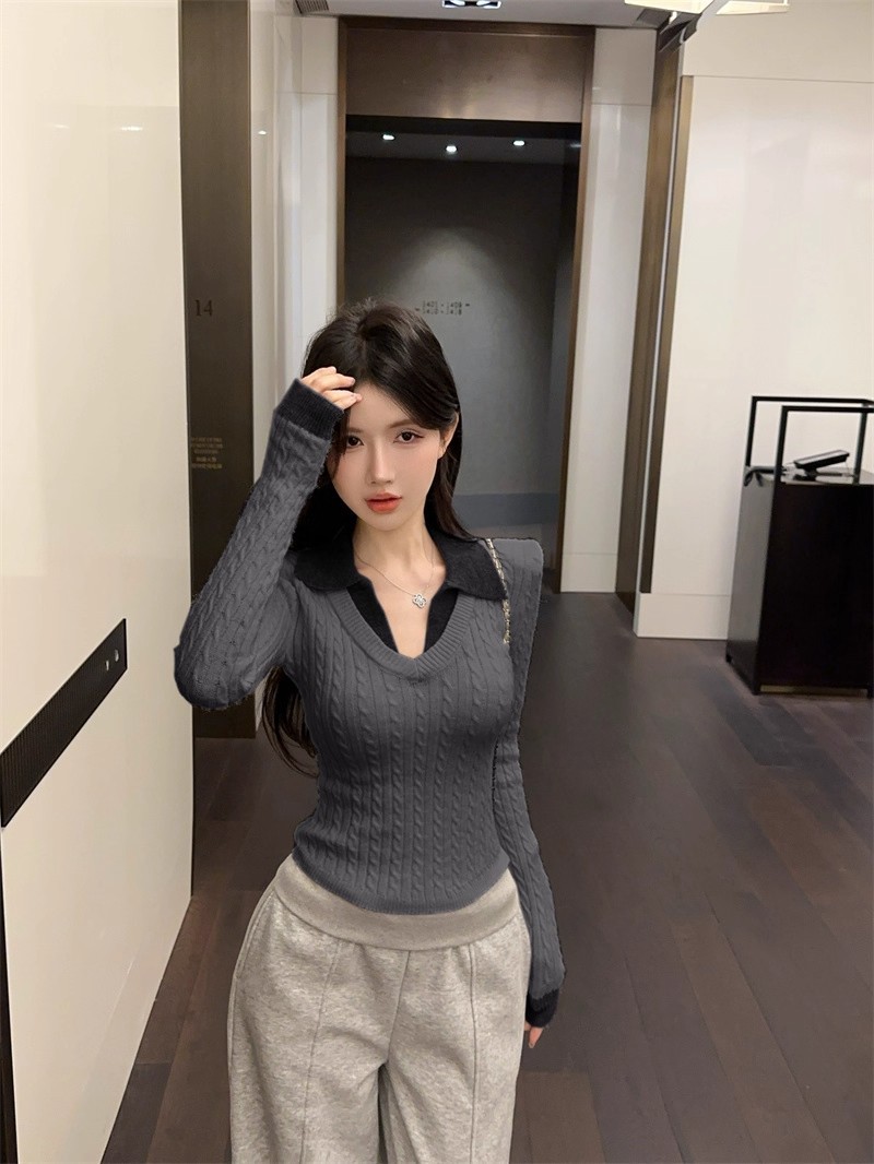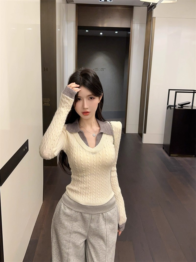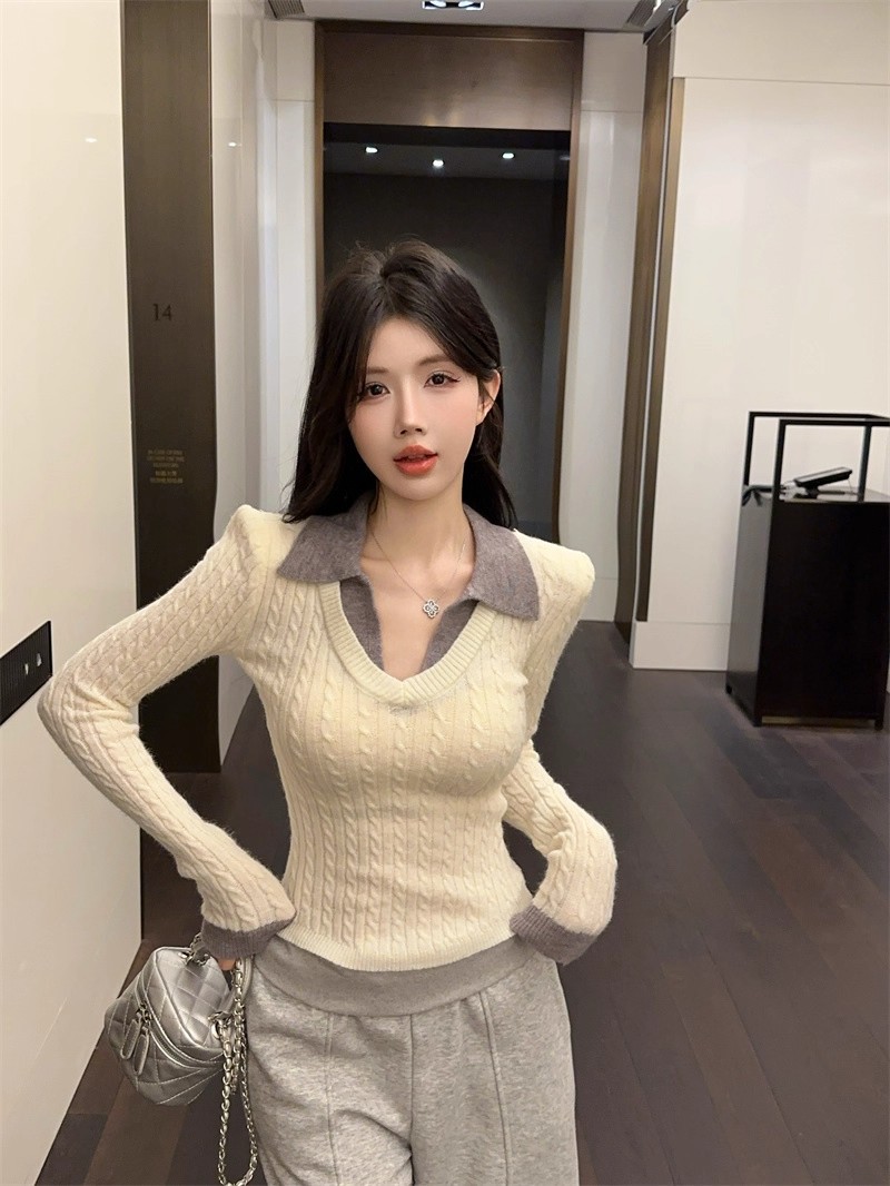 学院风假两件Polo领针织衫女秋冬纯欲v领上衣打底衫内搭麻花毛衣