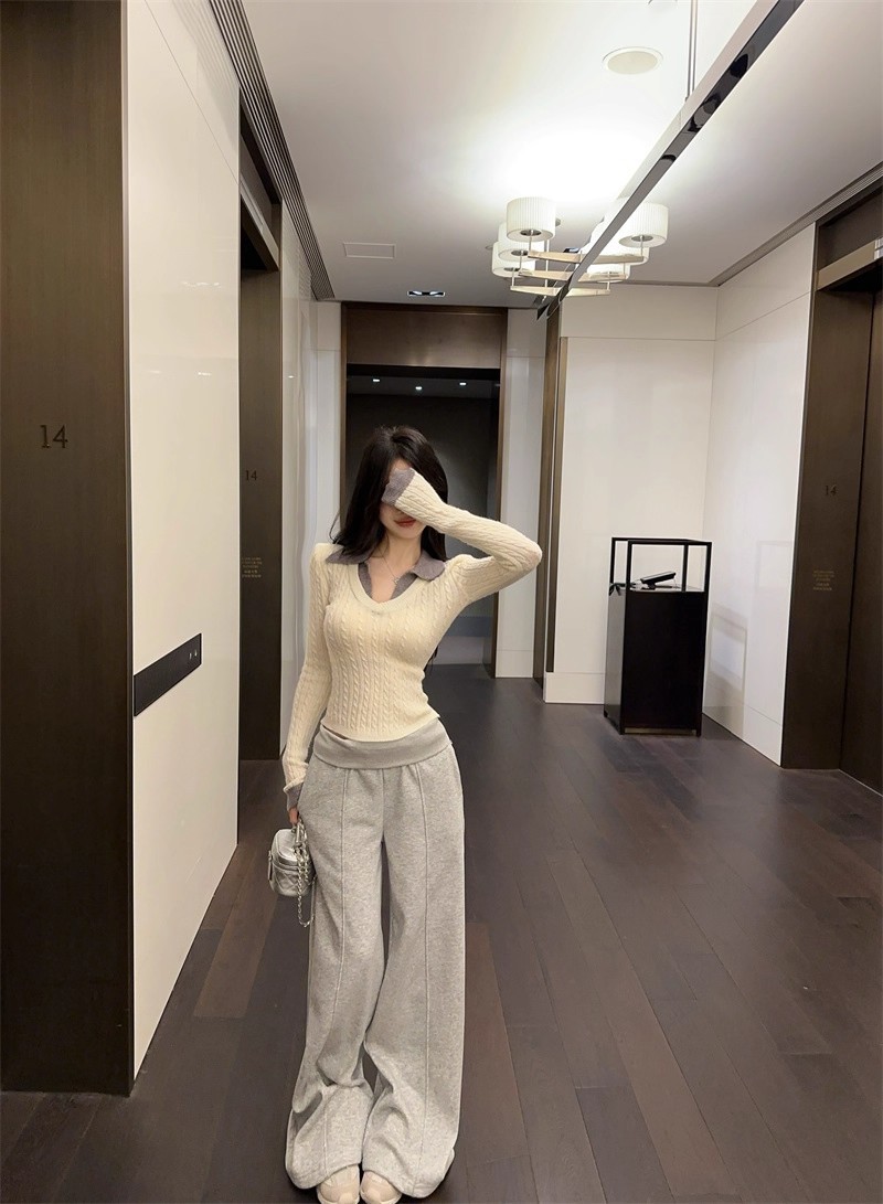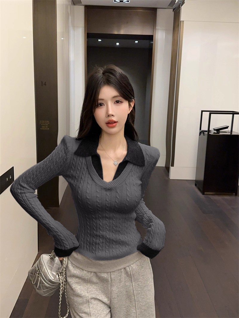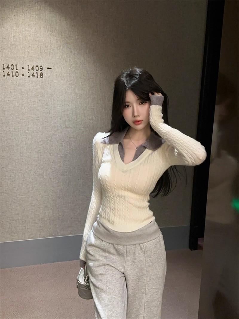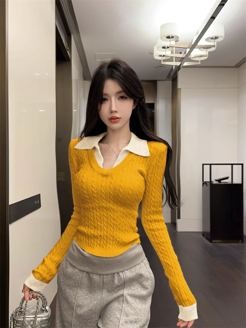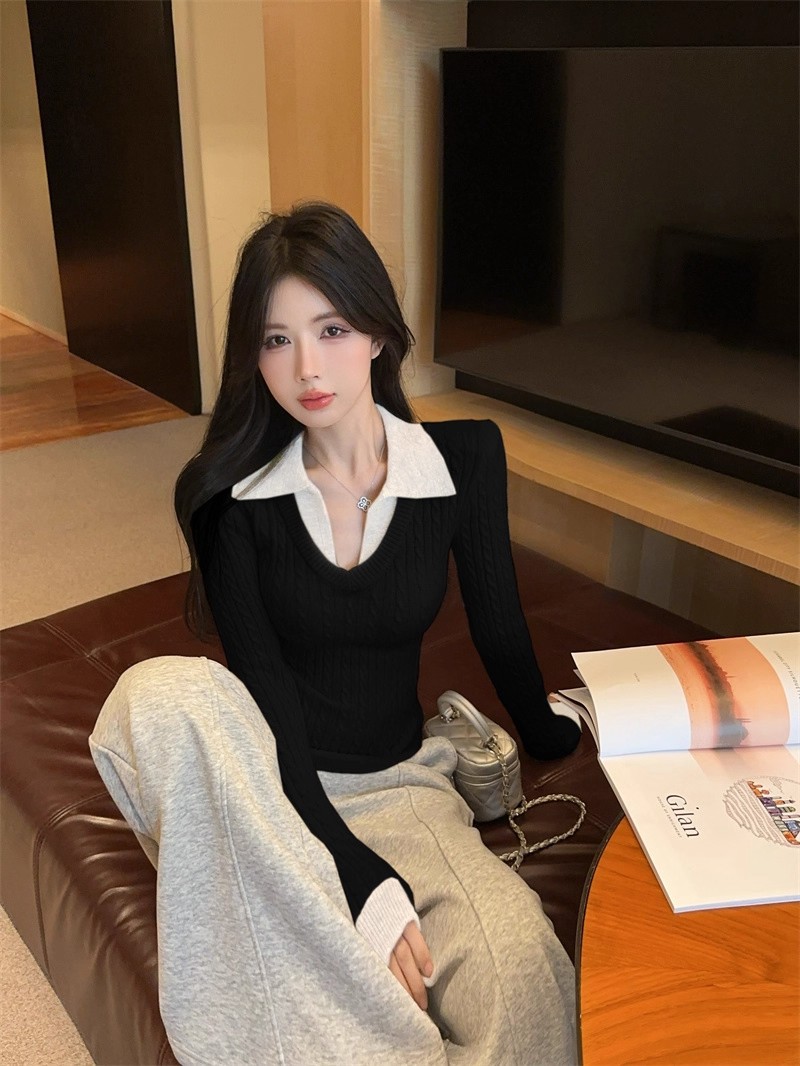 学院风假两件Polo领针织衫女秋冬纯欲v领上衣打底衫内搭麻花毛衣