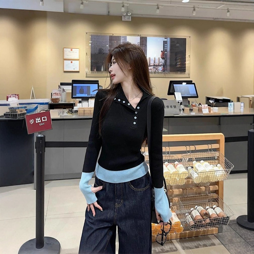 拼接撞色设计感翻领打底毛衣女修身显瘦气质加厚针织