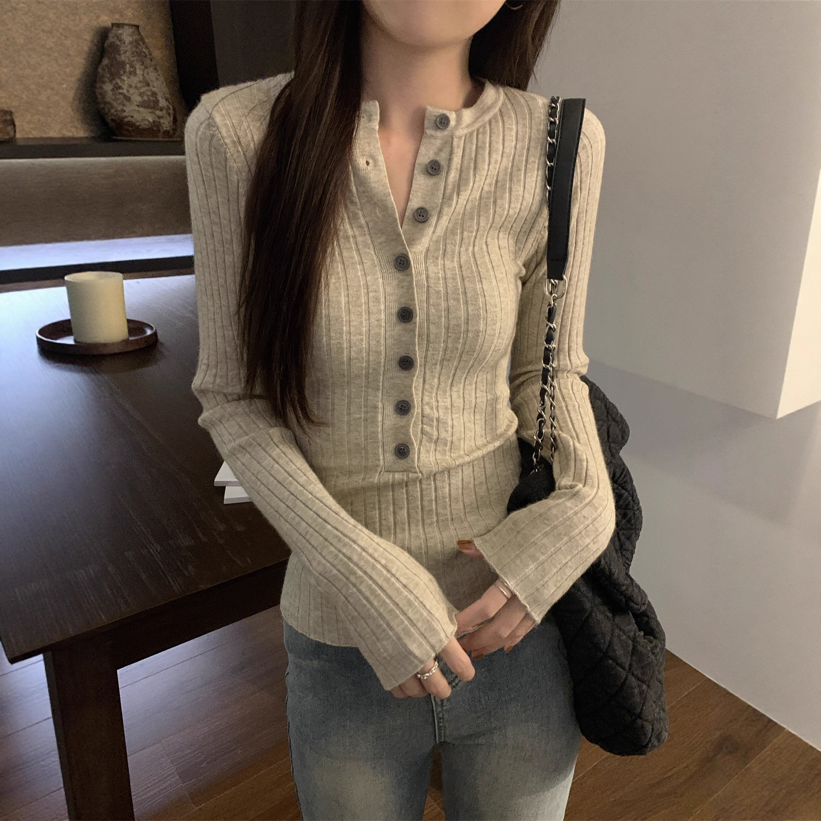 韩版半开领正肩长袖针织衫女早秋内搭设计感纽扣修身毛衣打底上衣