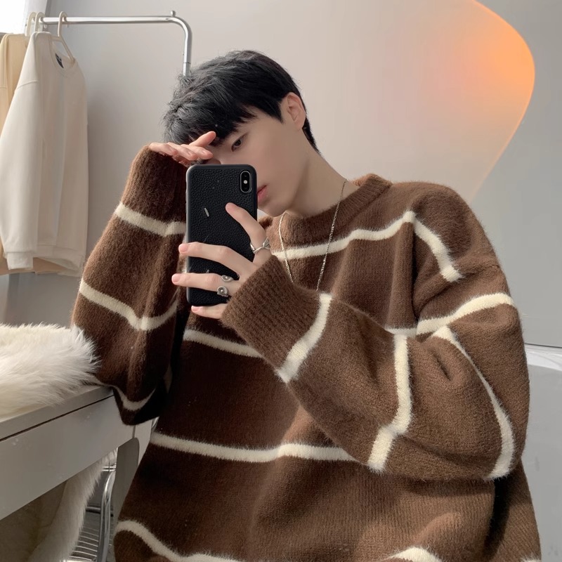 撞色条纹毛衣男秋冬季慵懒风宽松加厚美式高级感青少年情侣针织衫