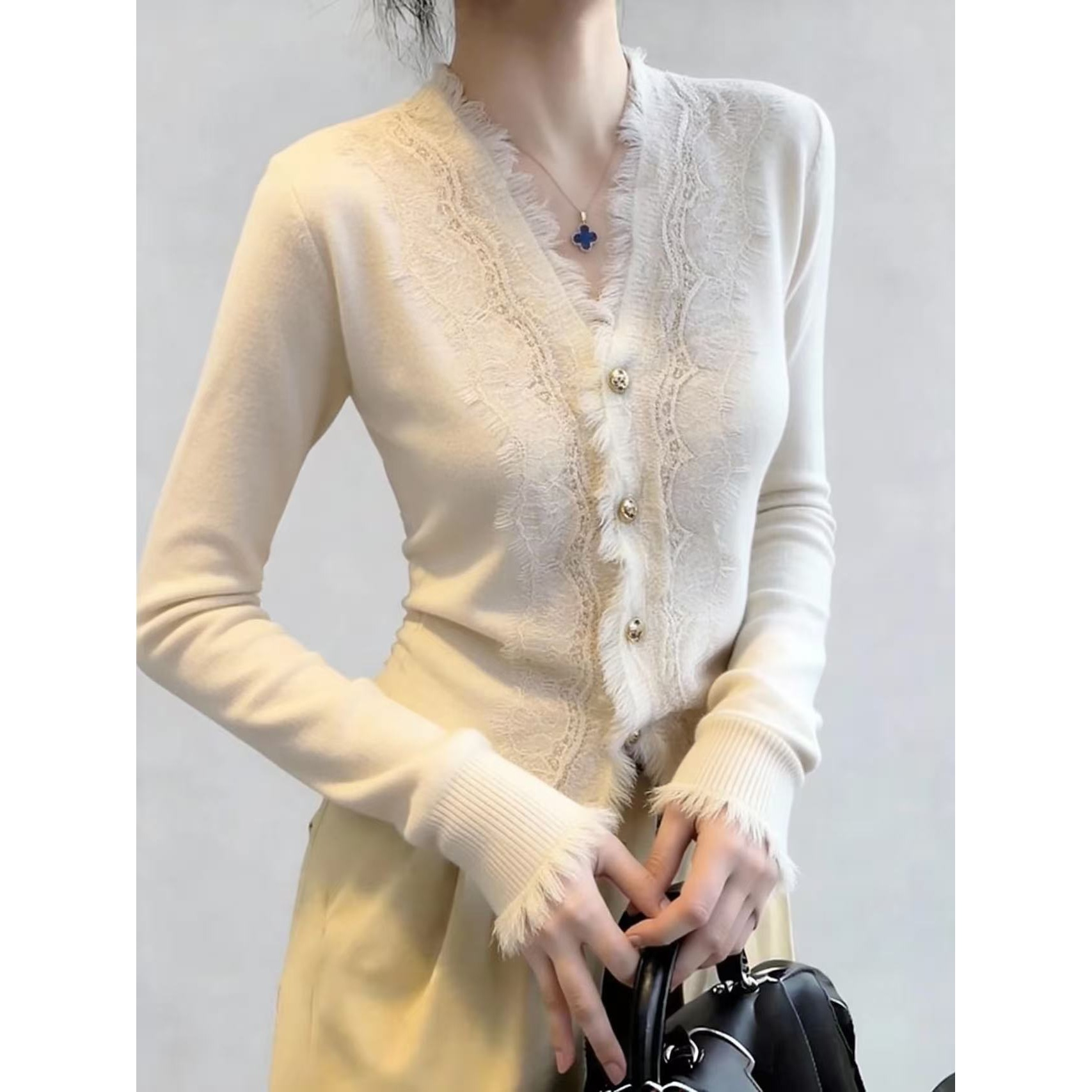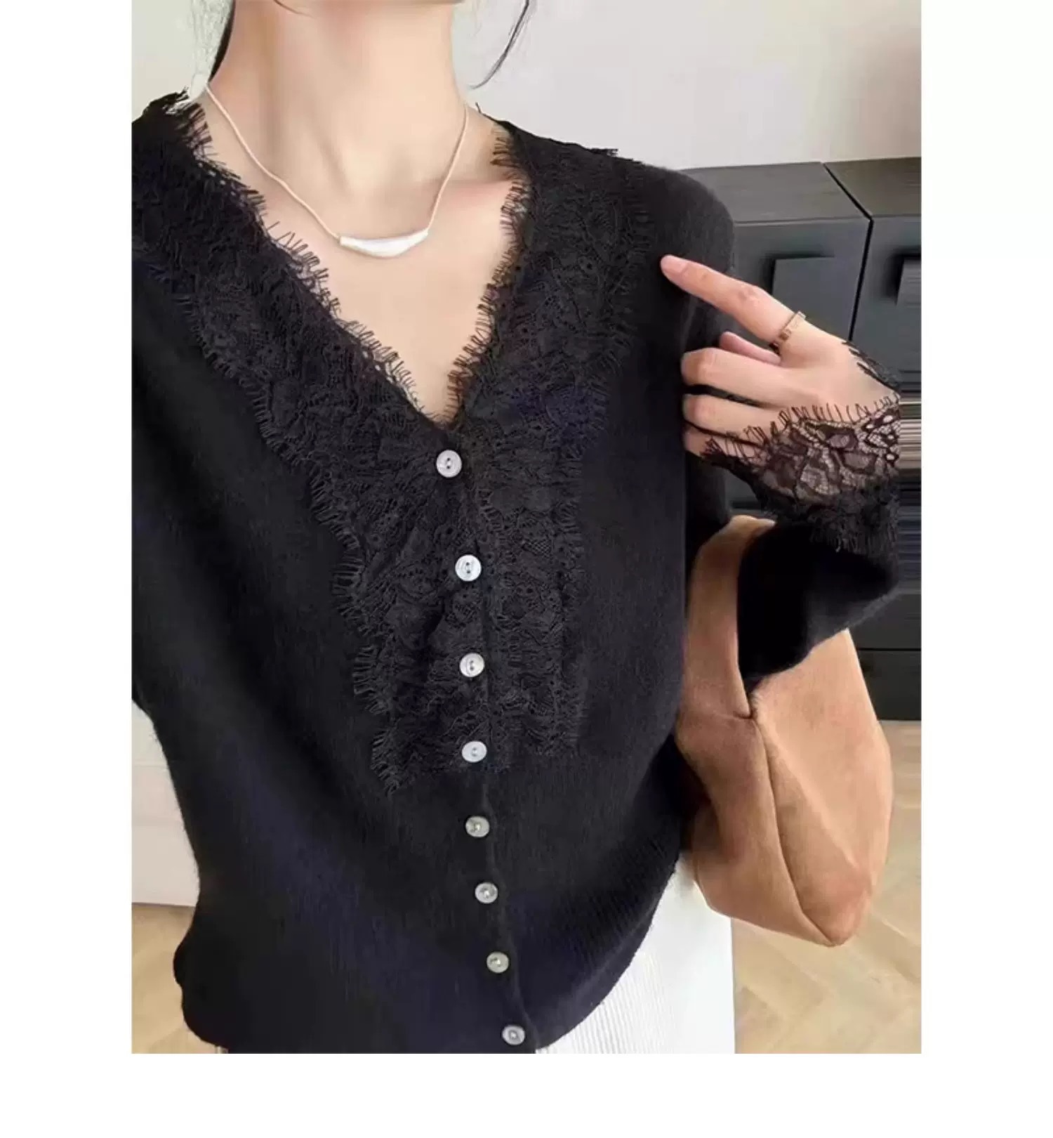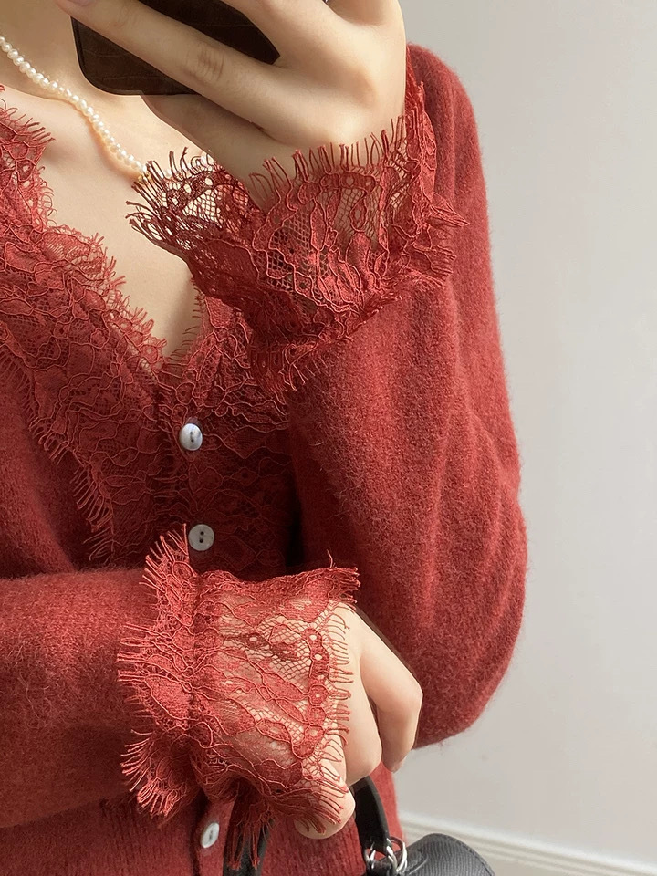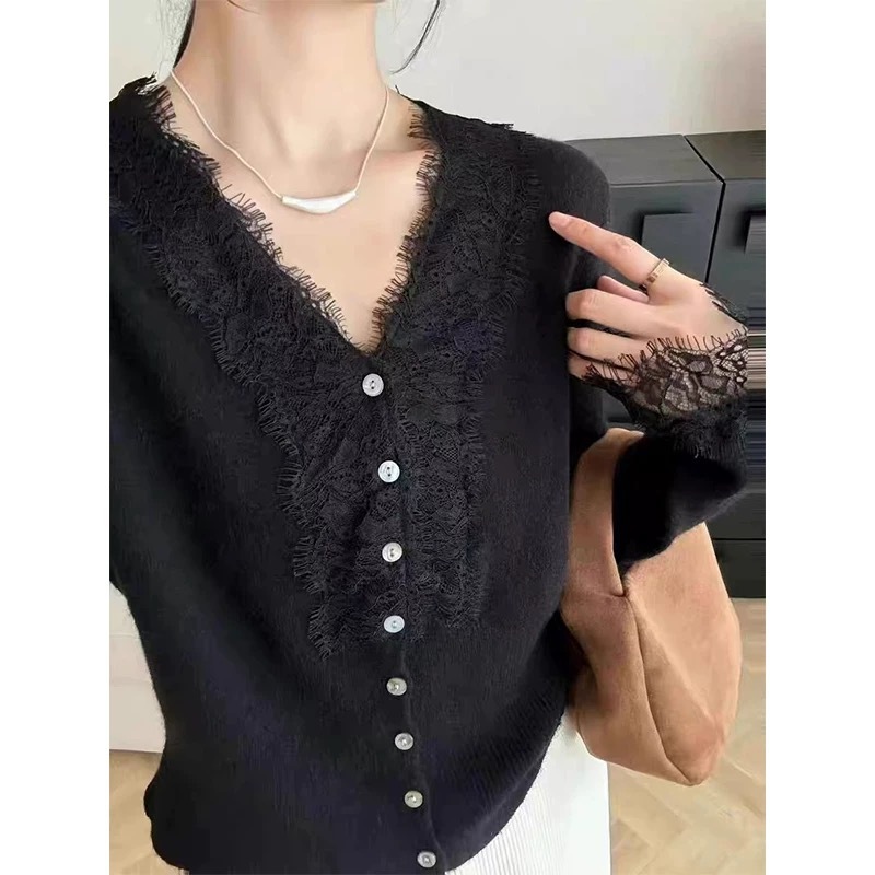 法式设计感针织衫女毛衣V领洋气收腰蕾丝开衫内搭薄款上衣25新款
