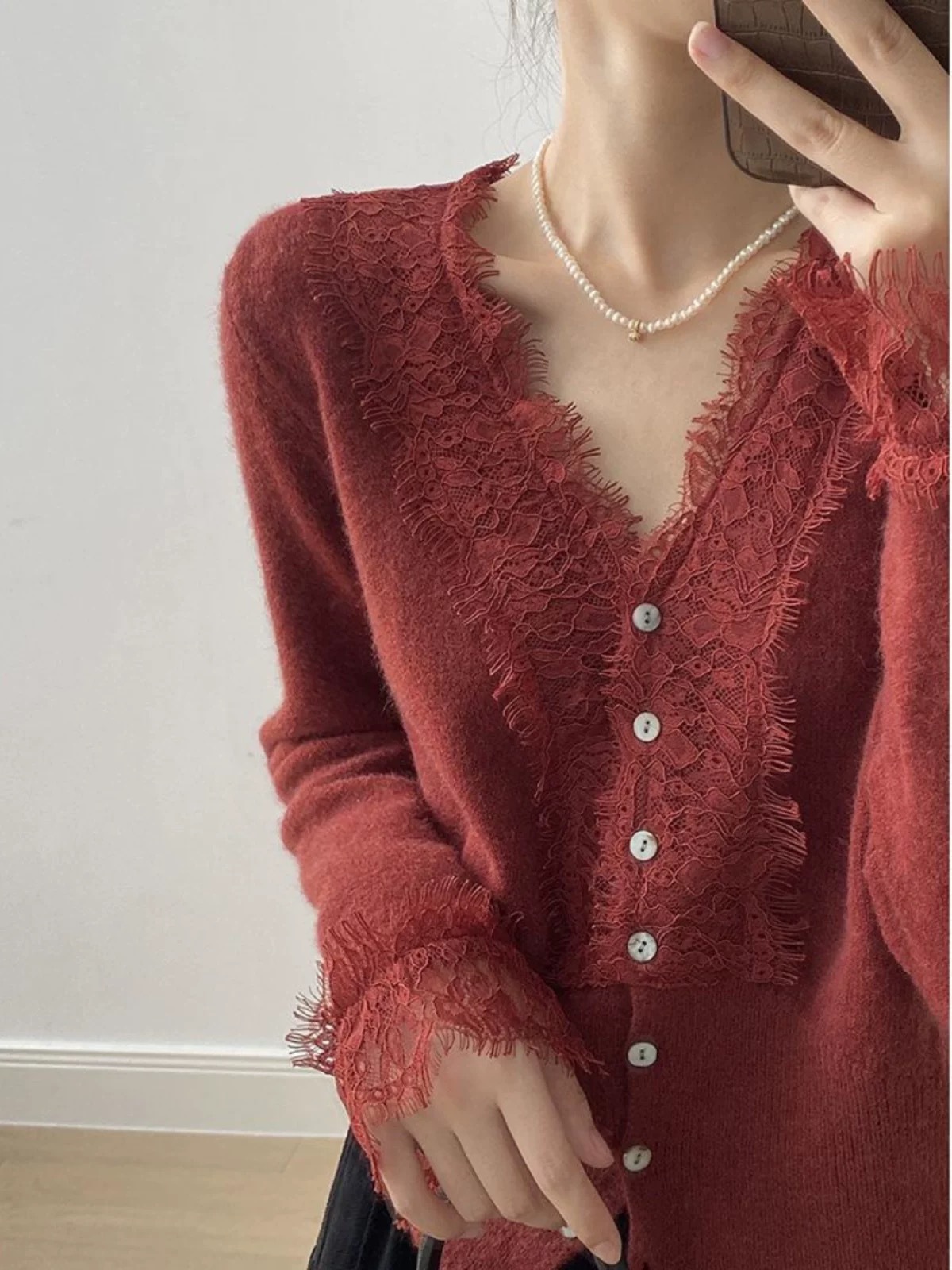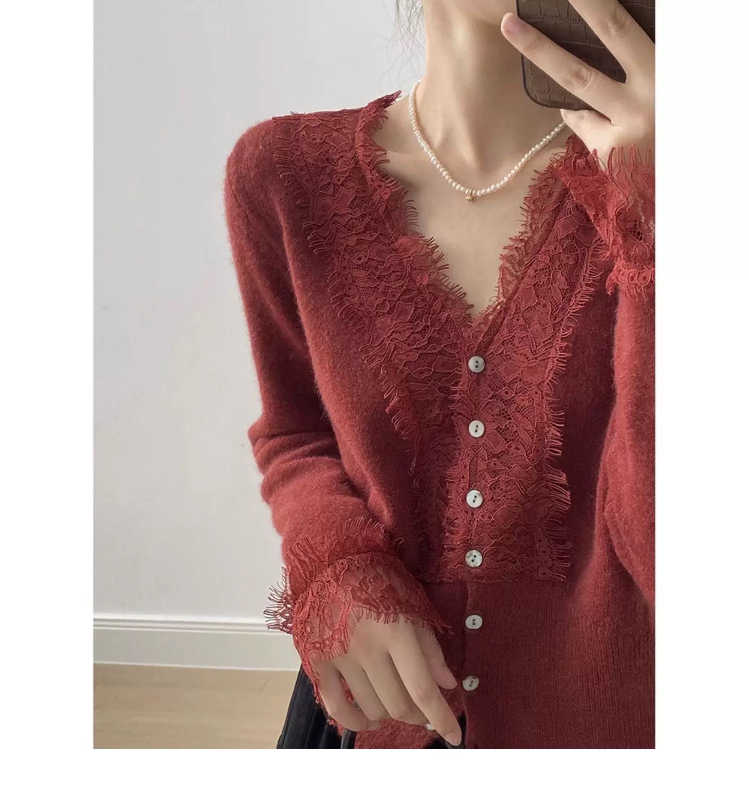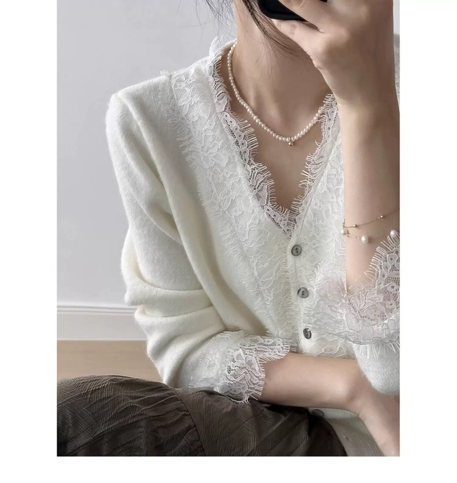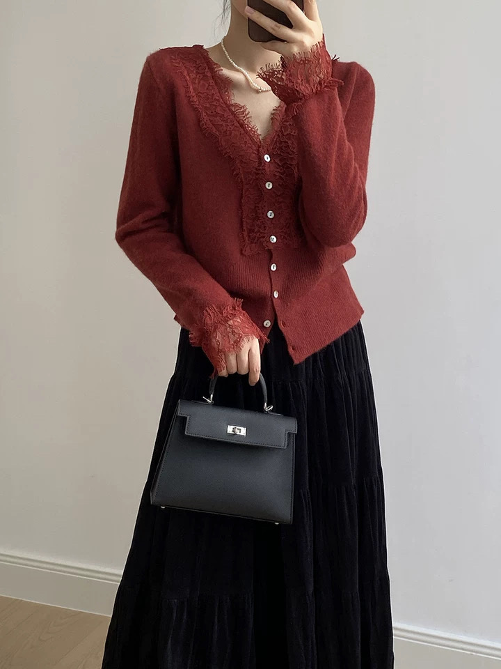 法式设计感针织衫女毛衣V领洋气收腰蕾丝开衫内搭薄款上衣25新款