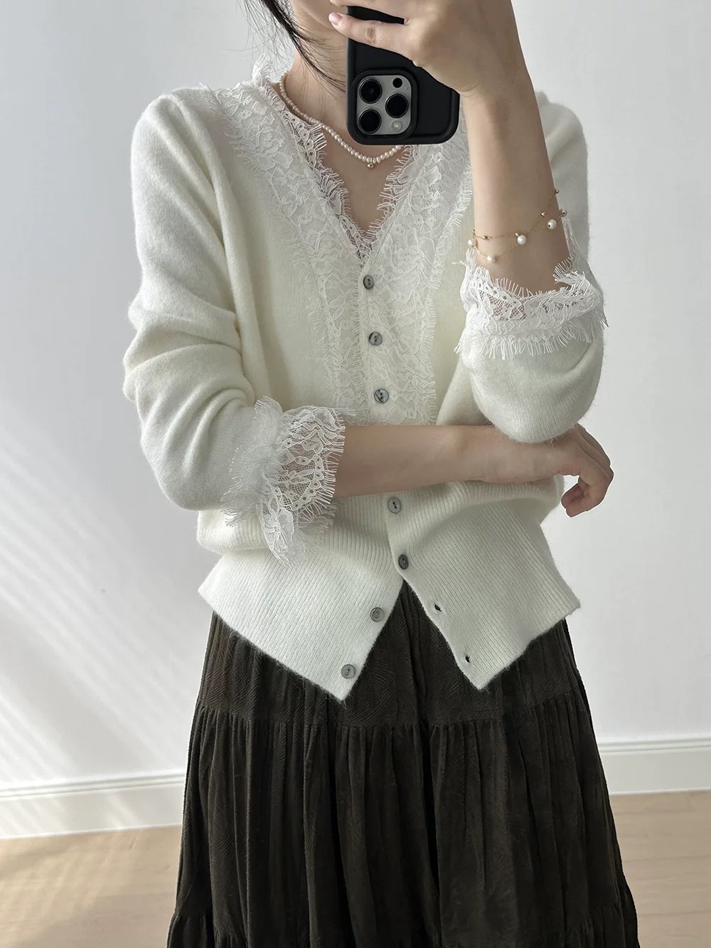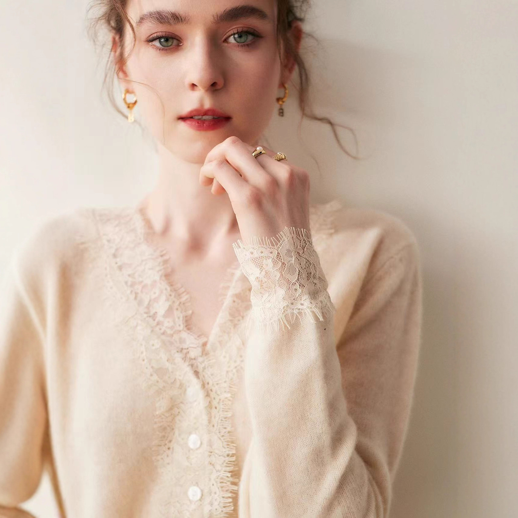 薄雾朦胧 水溶蕾丝花边羊绒开衫女V领亲肤羊绒宽松大码针织打底衫