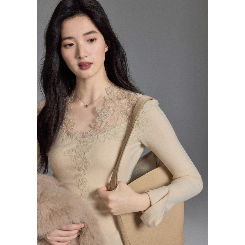 2025款别致V领蕾丝洋气打底衫女秋冬感毛衣内搭长袖针织衫上衣潮