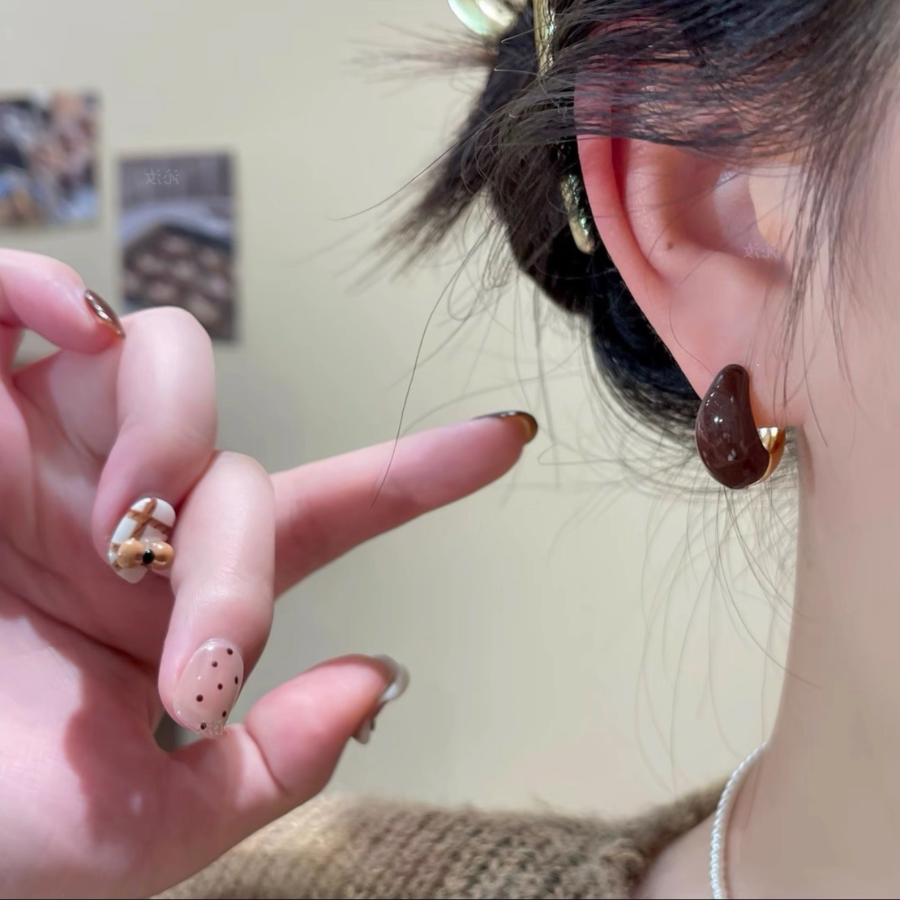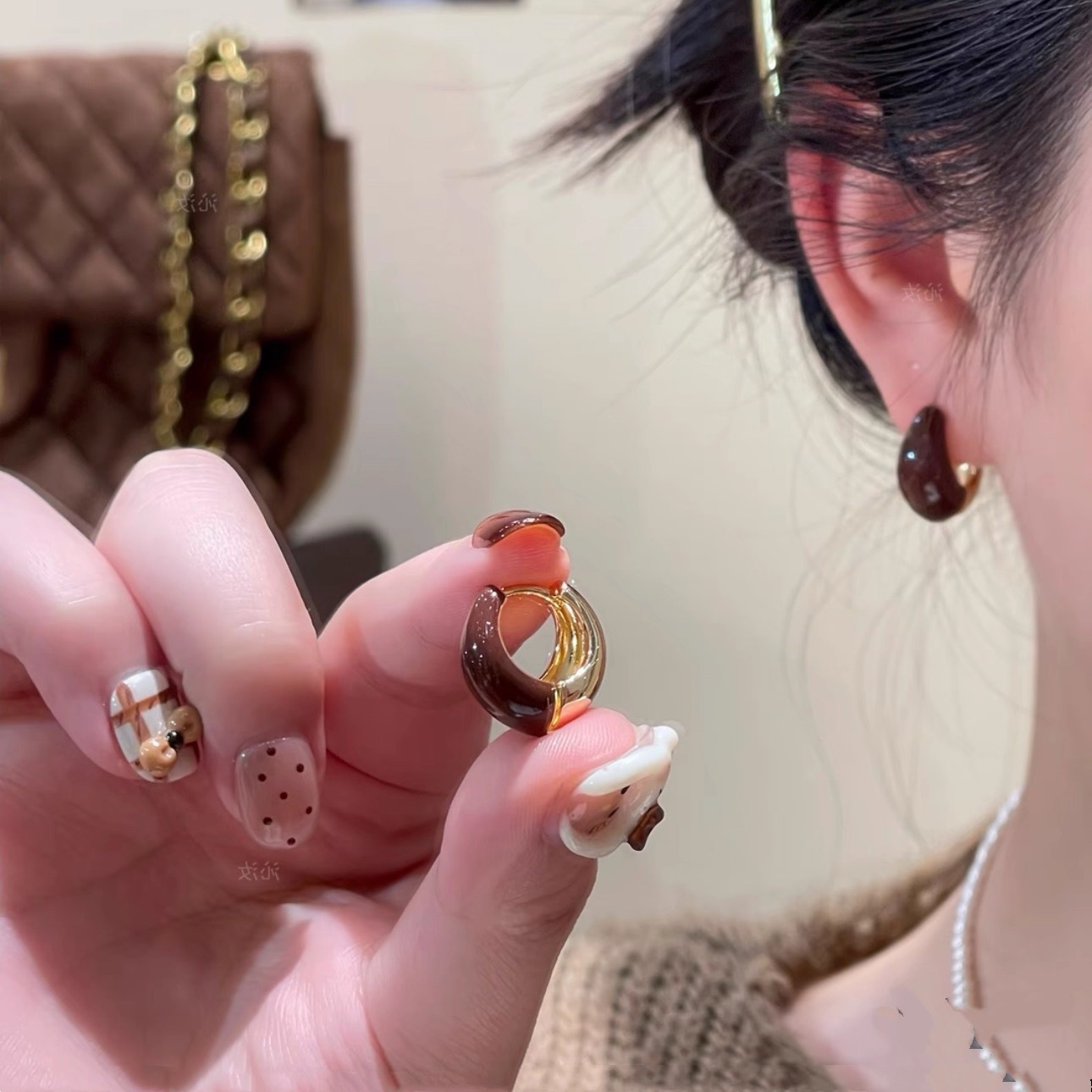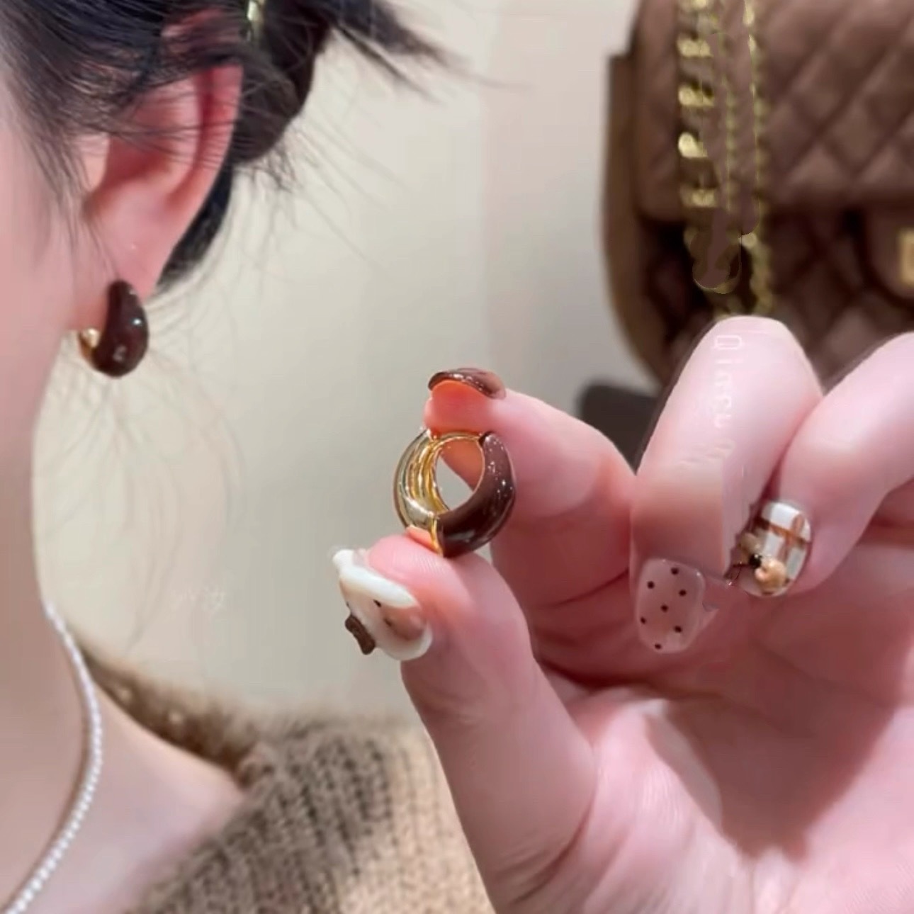 简约双面戴咖色耳扣珐琅滴油水滴耳圈耳环小巧百搭温柔气质耳饰品
