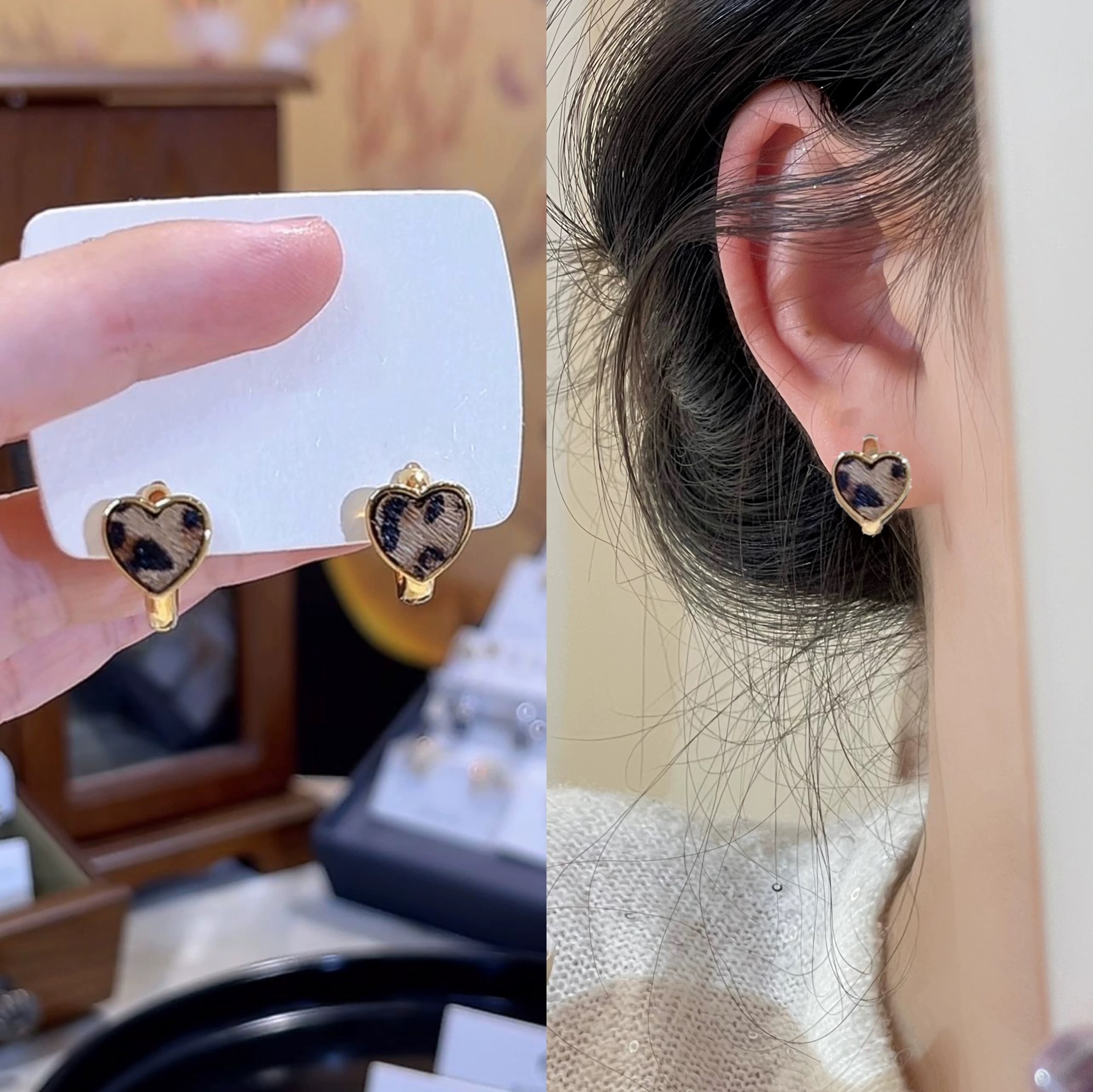 ヒョウ柄の輪のイヤリングは軽くて高級感があります。耳にエナメルのピアスをかけます。