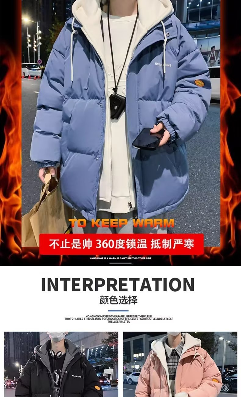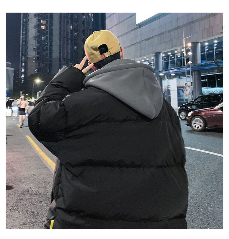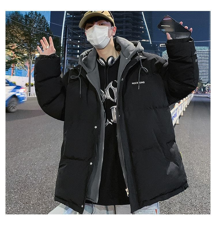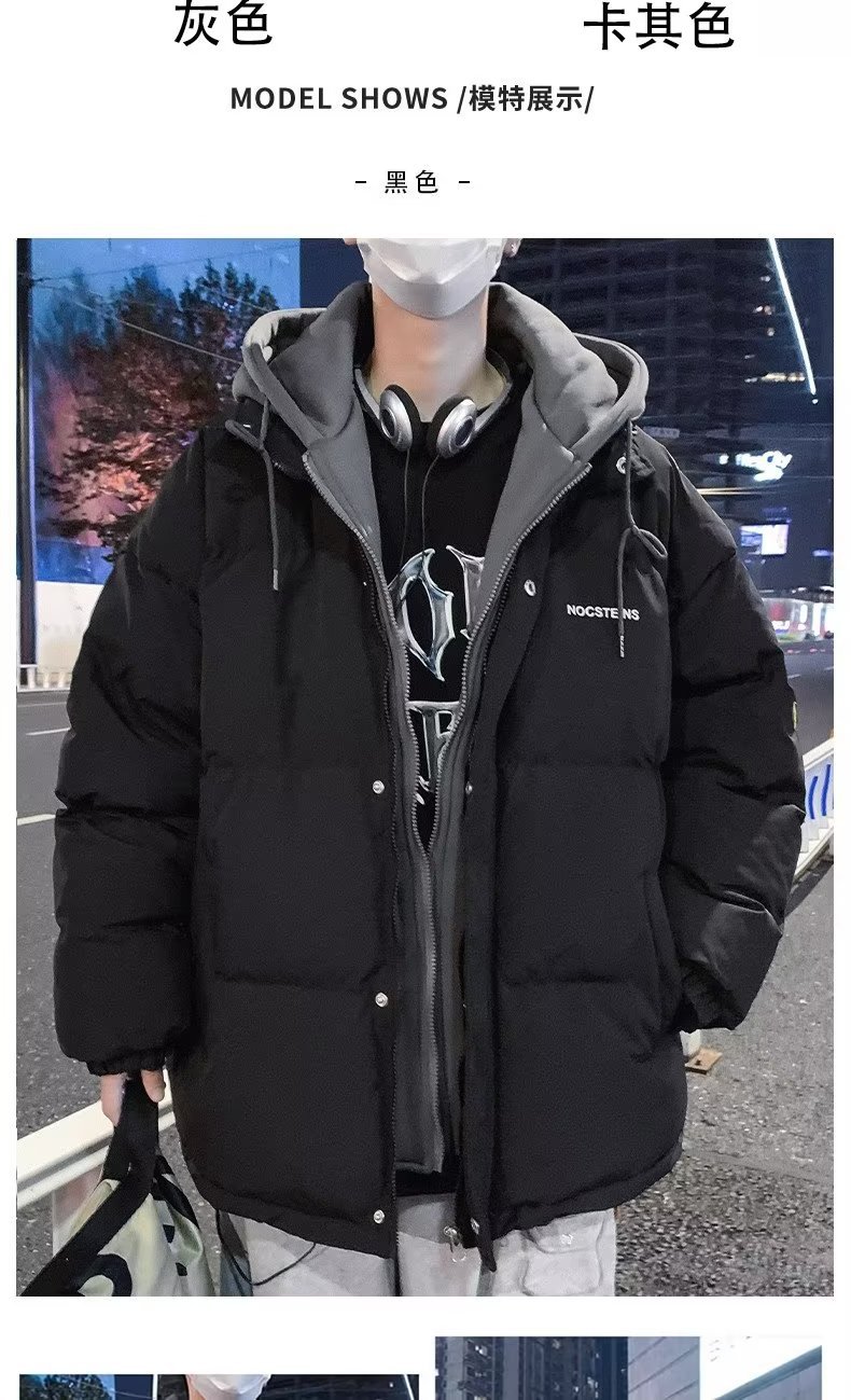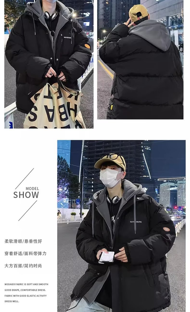 美式假俩件羽绒棉服男冬季潮牌宽松防寒连帽青少年面包服棉衣外套