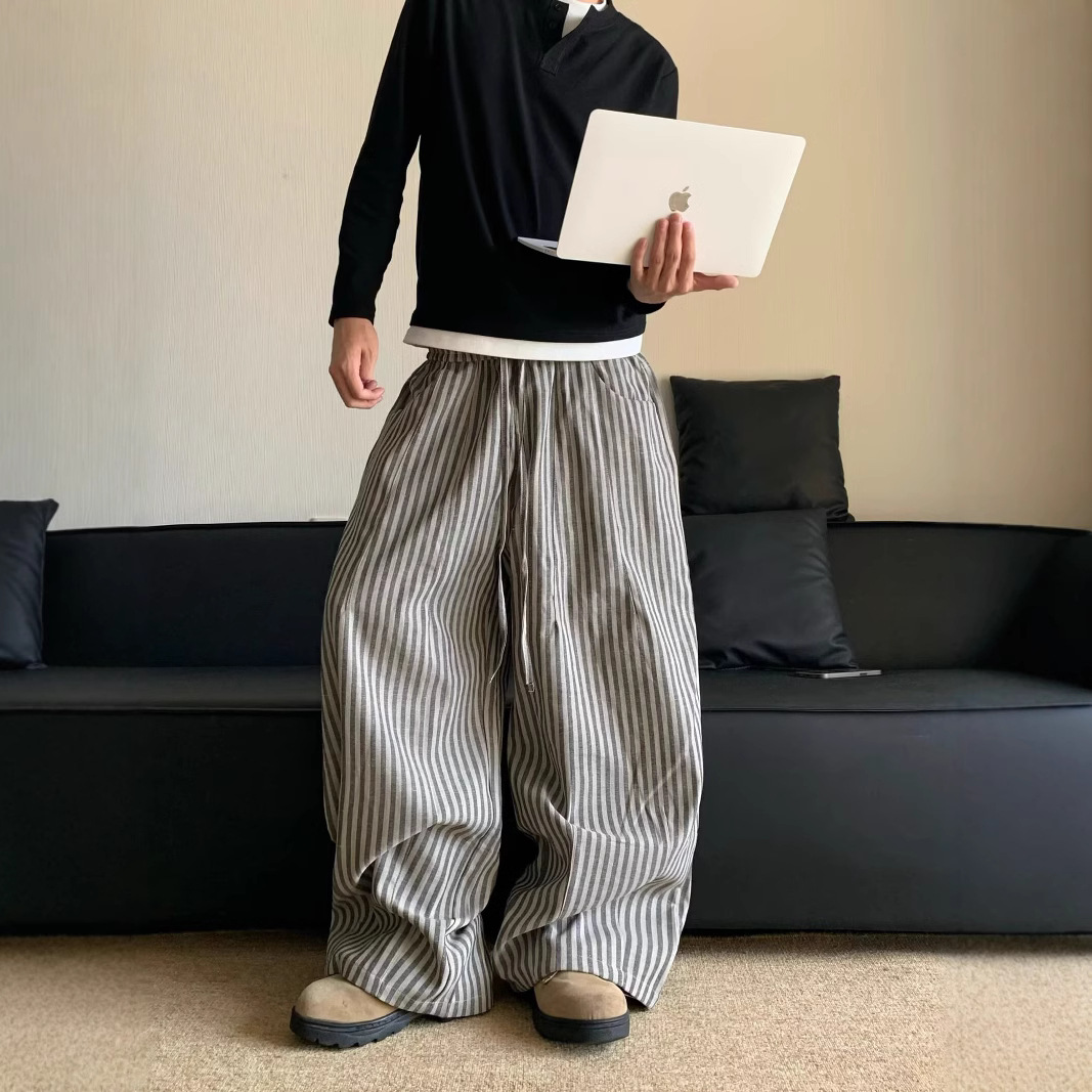 アメリカンリラックス縦ストライプカジュアルパンツメンズ春秋新作レイジースタイルストレートシミターワイドレッグフロアレングスパンツ